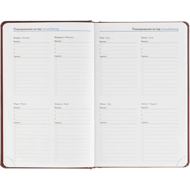 Внутренний блок включает 168 листов белой офсетной бумаги плотностью 70 г/кв.м. Страницы размечены в линейку и напечатаны в две краски. Перфорация уголков и вырубка блока упрощают навигацию по датам. Скруглённые углы листов повышают удобство в работе с ежедневником.