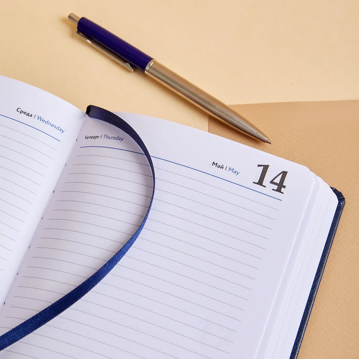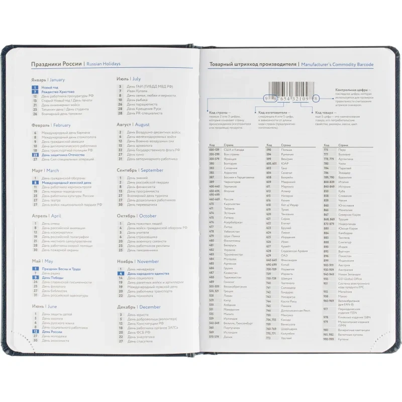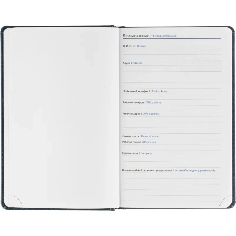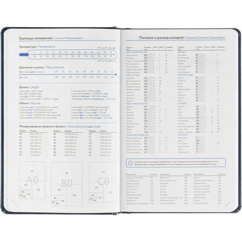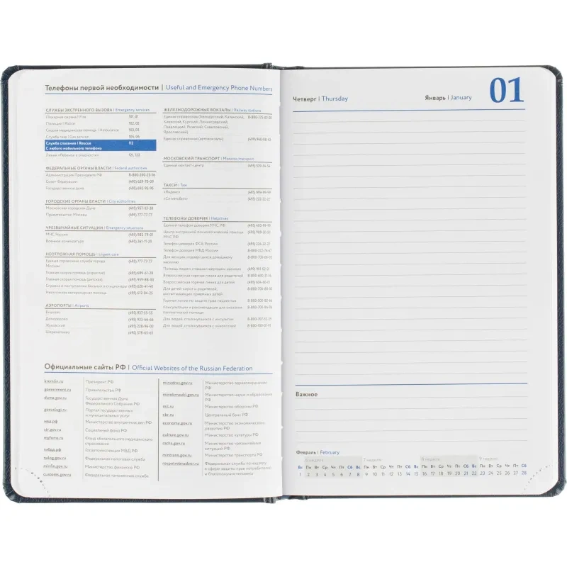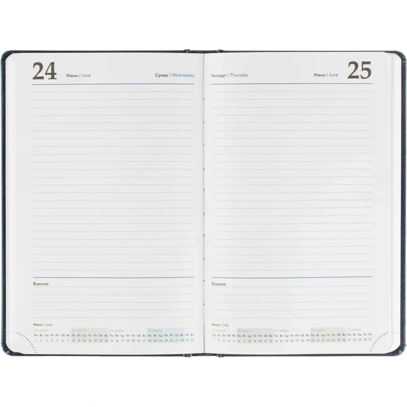 Внутренний блок включает 168 листов белой офсетной бумаги плотностью 70 г/кв.м. Страницы оформлены в линейку и напечатаны в две краски. Перфорация уголков и вырубка блока позволяют легко находить нужную дату. Скруглённые углы листов повышают комфорт при перелистывании.