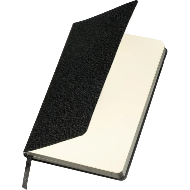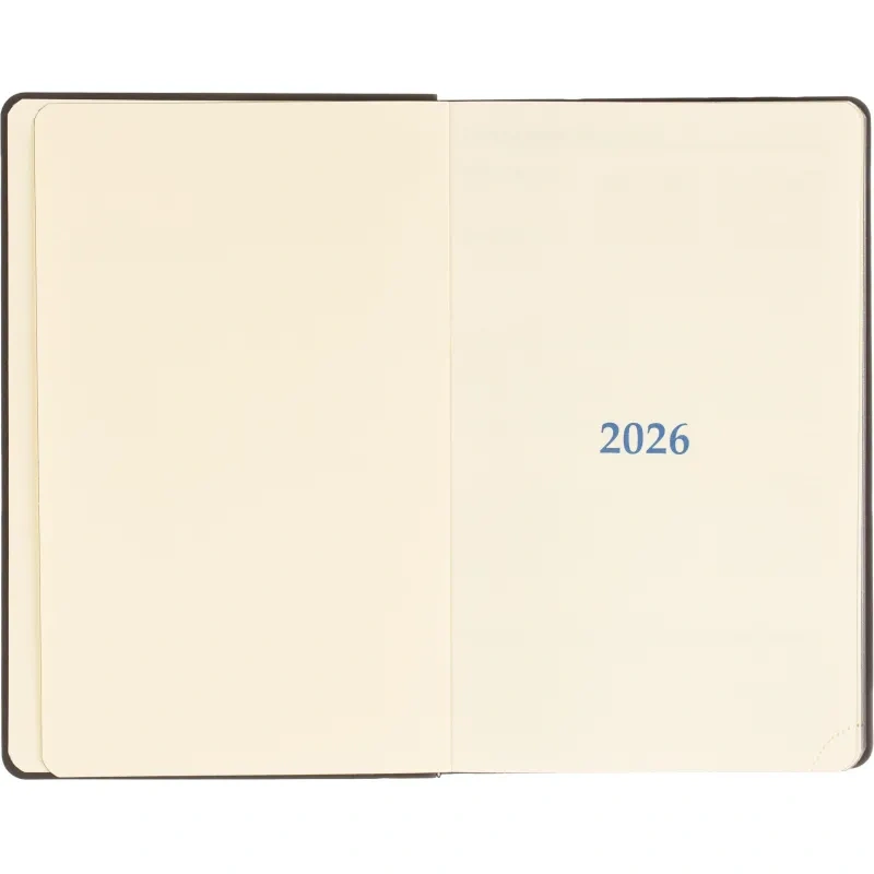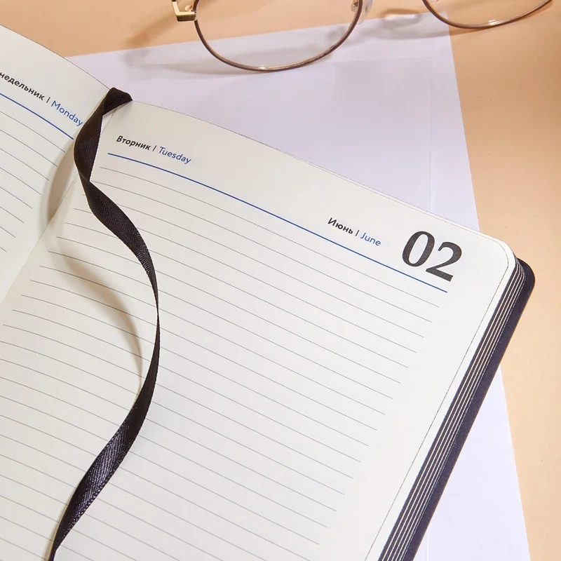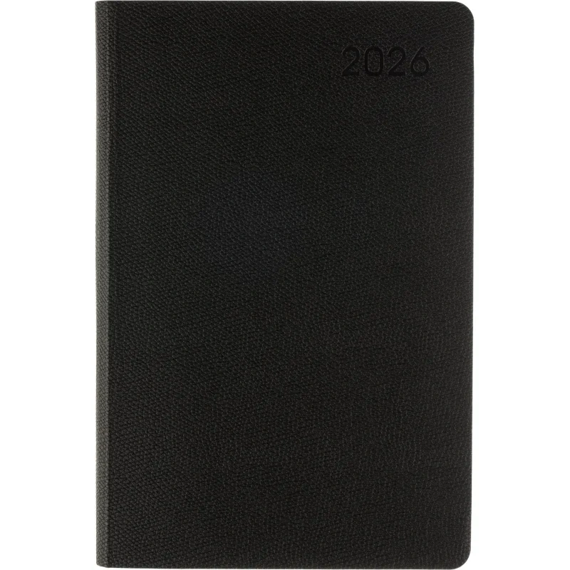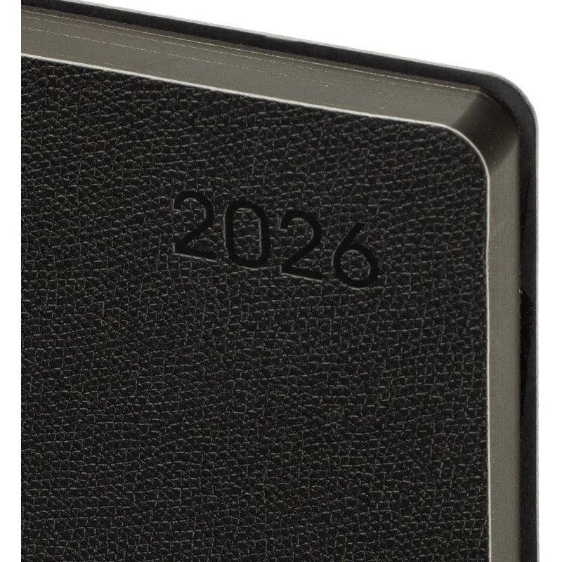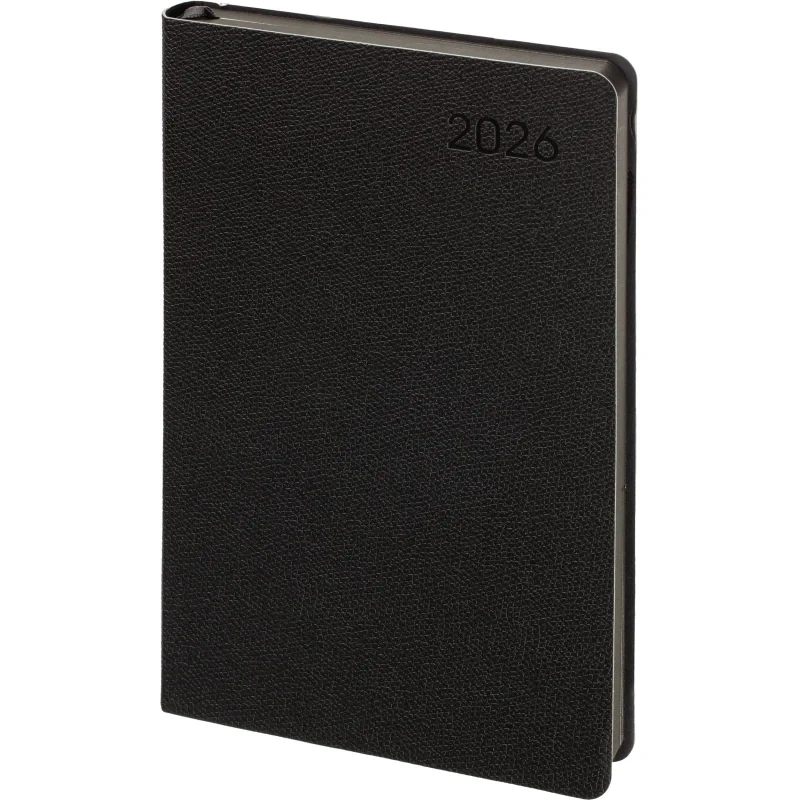 Ежедневник формата A5 предназначен для записи планов, заметок и задач на протяжении 2026 года. Обложка выполнена из искусственной кожи чёрного цвета с тиснением и однотонным оформлением. Мягкий переплёт делает изделие более лёгким и гибким, а сшивка блока обеспечивает его надёжность при активном использовании.