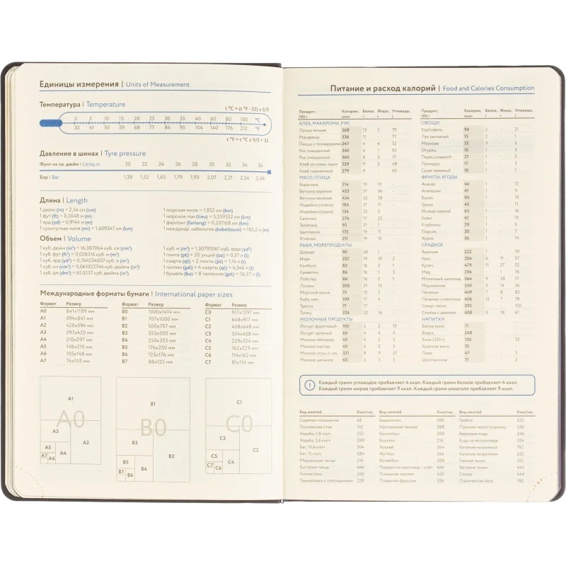 Внутренний блок состоит из 168 листов офсетной бумаги плотностью 80 г/кв.м. Бумага тонированная, страницы размечены в линейку и напечатаны в две краски. Уголки листов снабжены перфорацией, а сам блок — вырубкой, что облегчает навигацию по датам. Чёрный обрез придаёт изделию выразительный внешний вид. Скруглённые углы листов повышают комфорт при перелистывании.