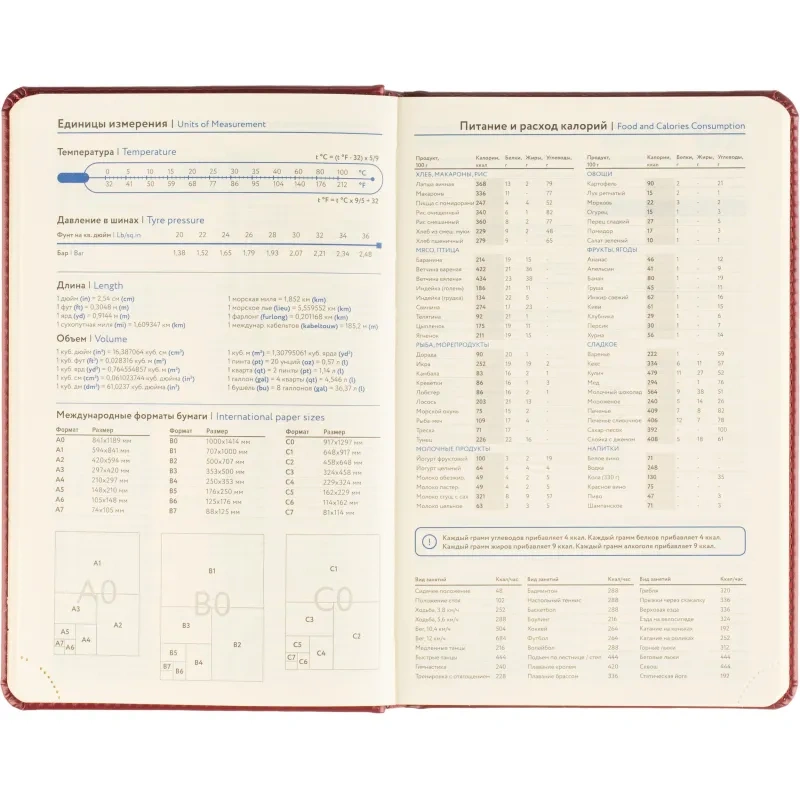 Внутренний блок изготовлен из офсетной бумаги плотностью 80 г/кв.м с линейной разметкой. Бумага тонированная, блок напечатан в две краски. Листы имеют скруглённые углы, а уголки дополнены перфорацией для лёгкого отслеживания текущей даты. Вырубка облегчает поиск нужной страницы.