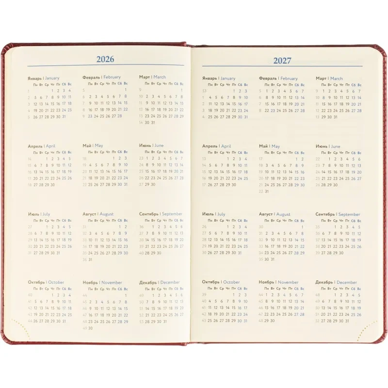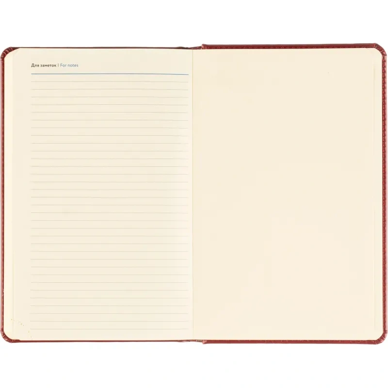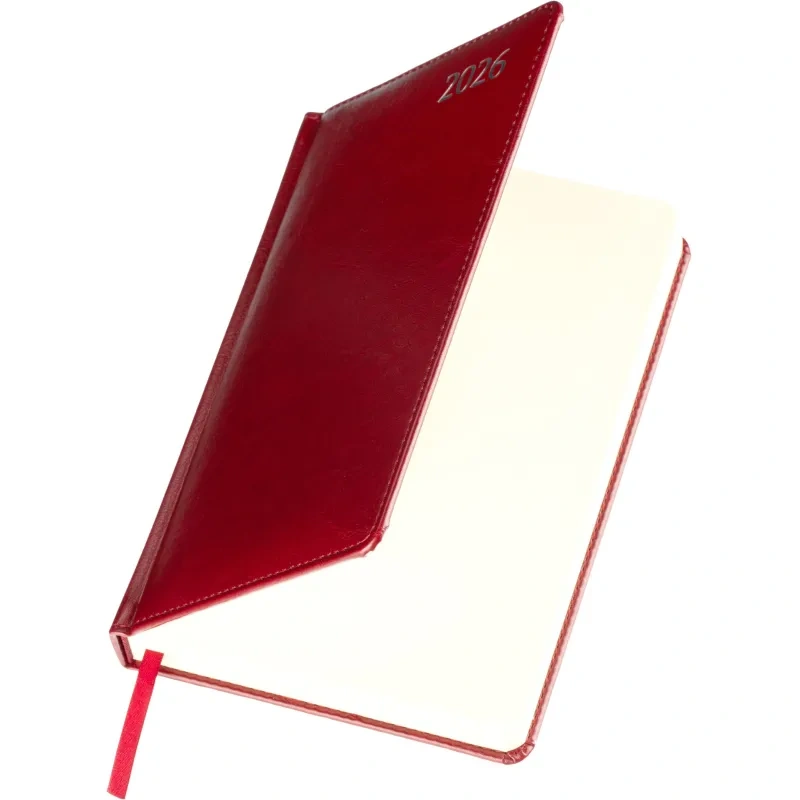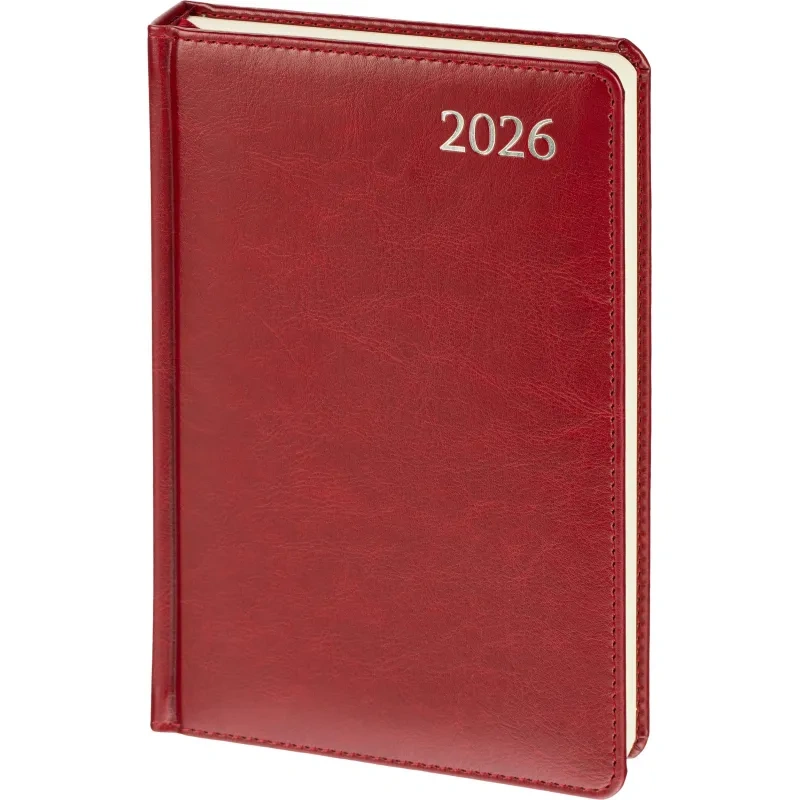 Ежедневник формата A5 предназначен для планирования дел и записи заметок в течение всего 2026 года. Обложка выполнена из искусственной кожи бордового цвета с тиснением и имеет однотонный дизайн. Жёсткий переплёт сохраняет форму изделия, а сшивка блока обеспечивает его надёжность при частом использовании.