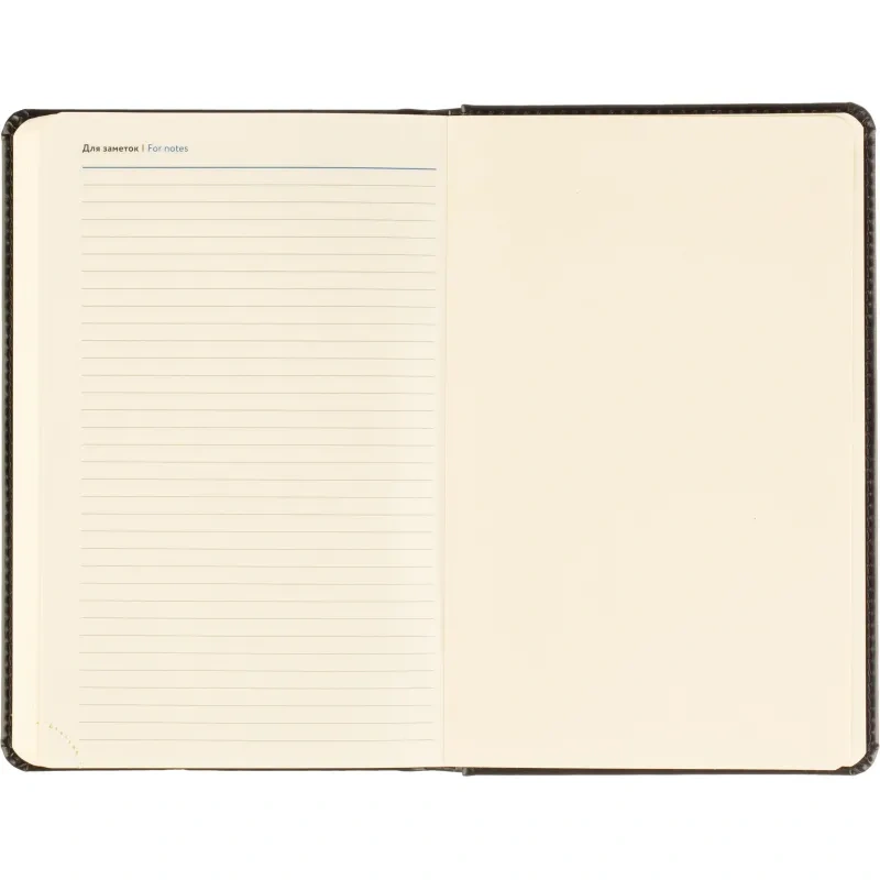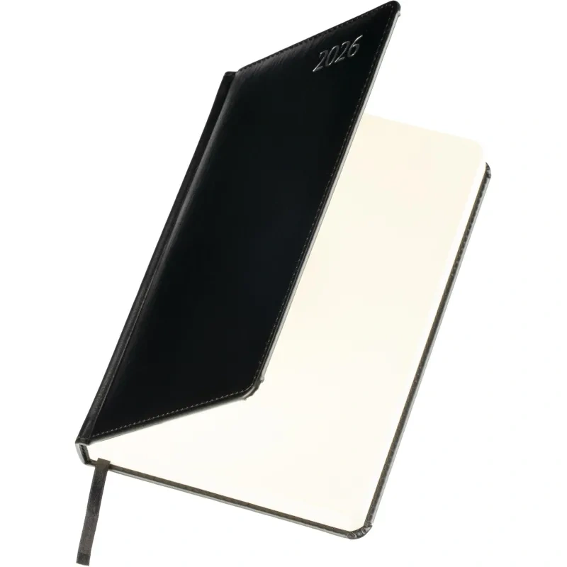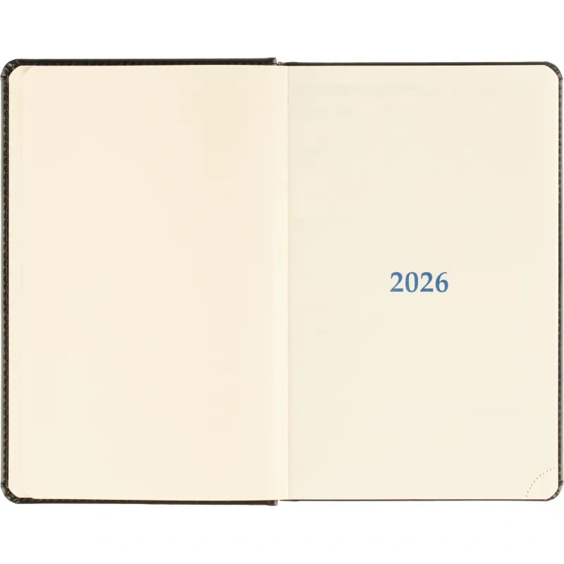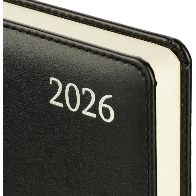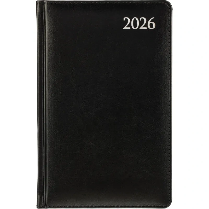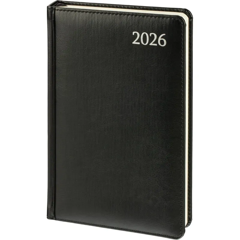 Ежедневник формата A5 подходит для ведения записей и планирования задач на протяжении всего 2026 года. Обложка выполнена из искусственной кожи чёрного цвета с тиснением и оформлена в однотонном стиле. Твёрдый переплёт сохраняет форму изделия, а сшивка блока обеспечивает прочность при ежедневном использовании.