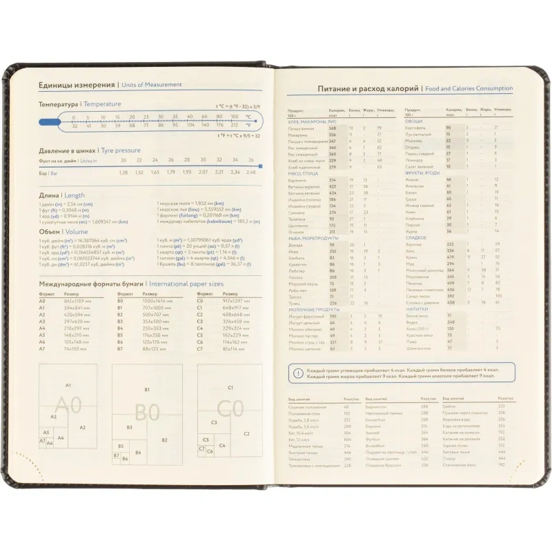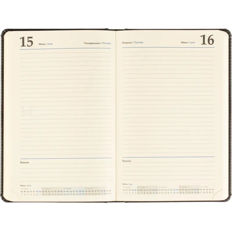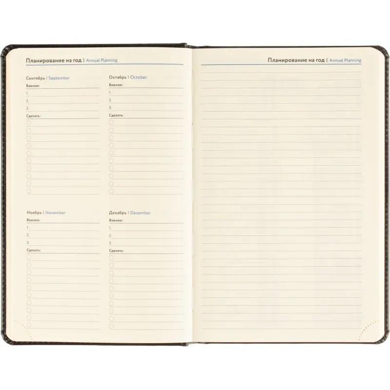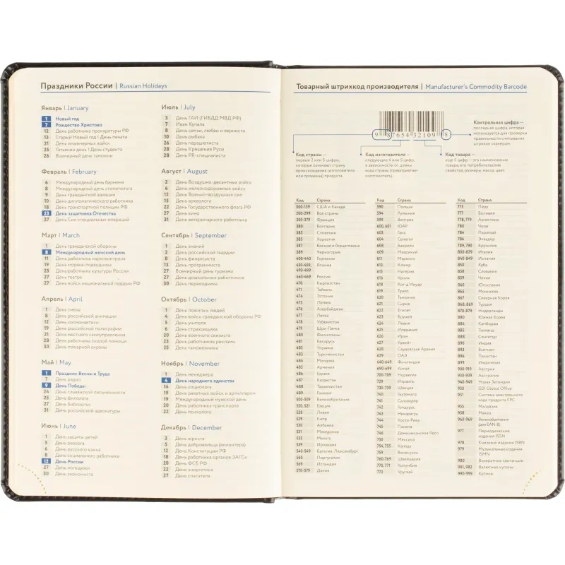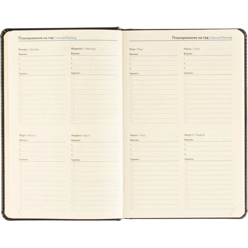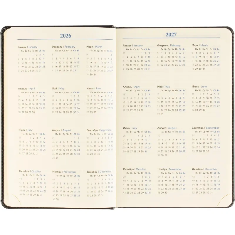 Размер изделия — 13.8×21.3 см. Внутри предусмотрен календарь на два года. Ежедневник подходит под персонализацию.
