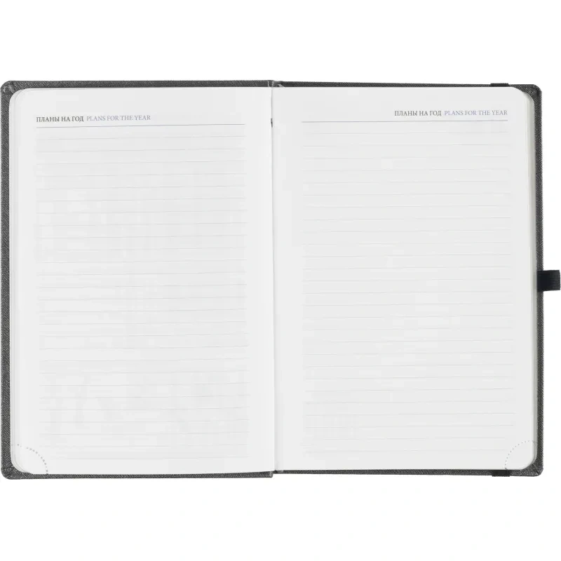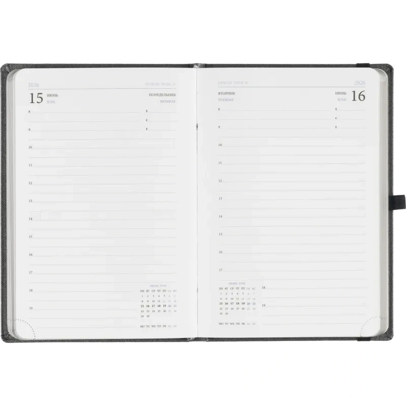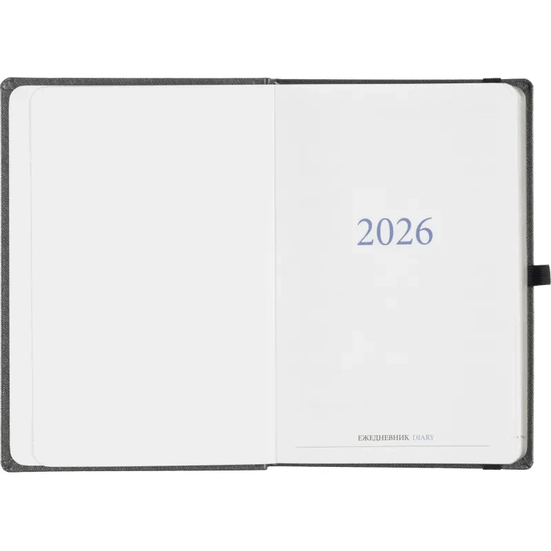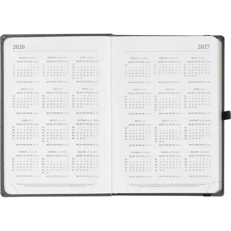 Среди дополнительных характеристик — ляссе серебристого цвета и уникальный блок, выполненный в двух цветах. Срез тонированный серебристый. Вертикальная резинка и петля под ручку. На страницах предусмотрен календарь на 2026-2027 гг., что позволяет удобно планировать мероприятия и торжественные даты.