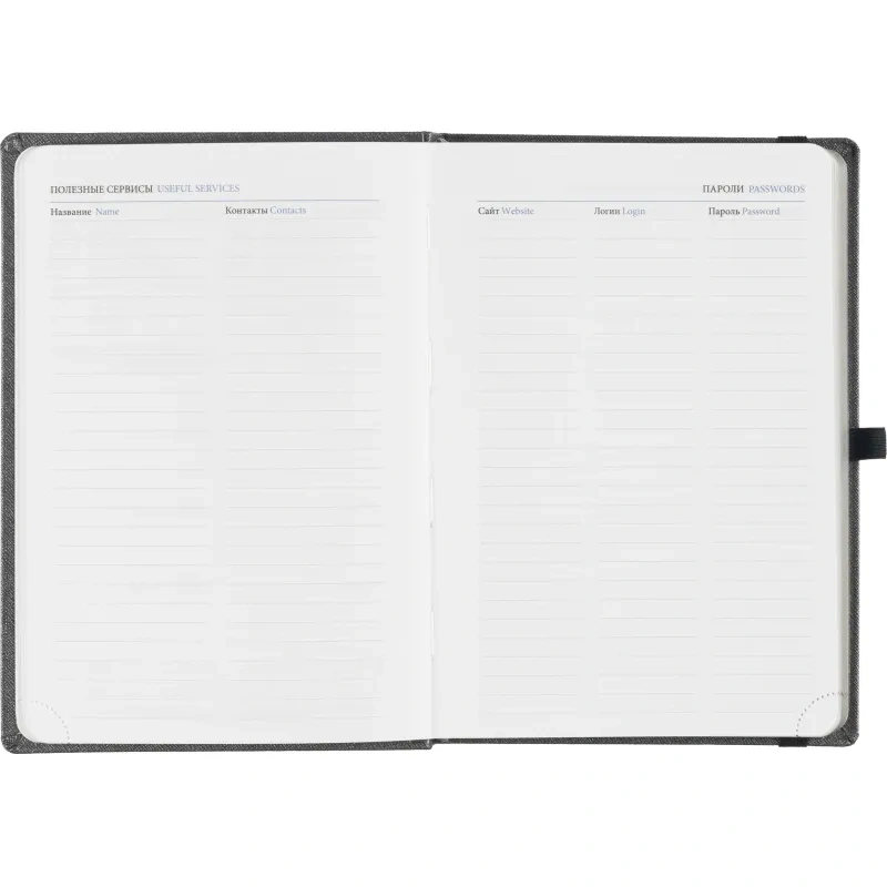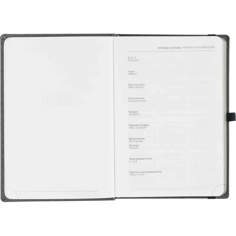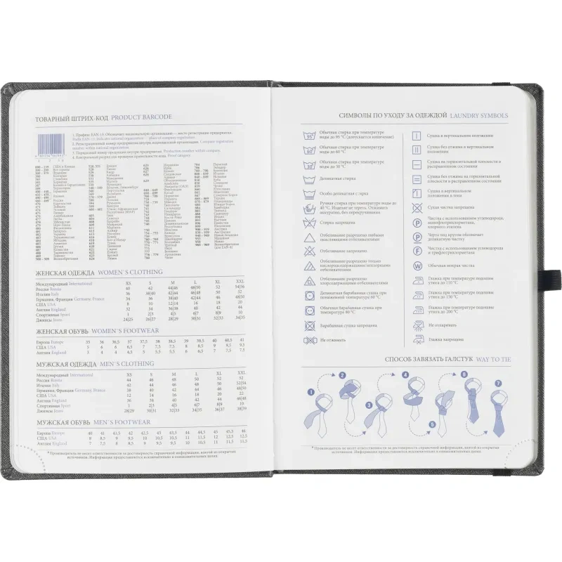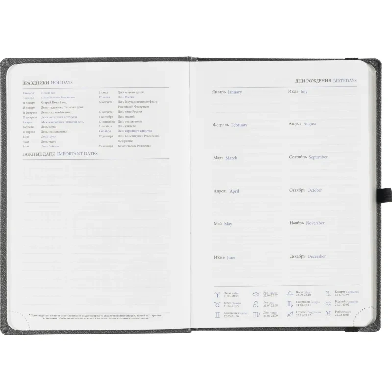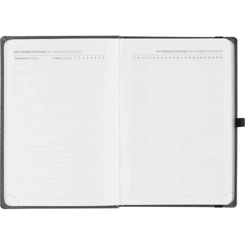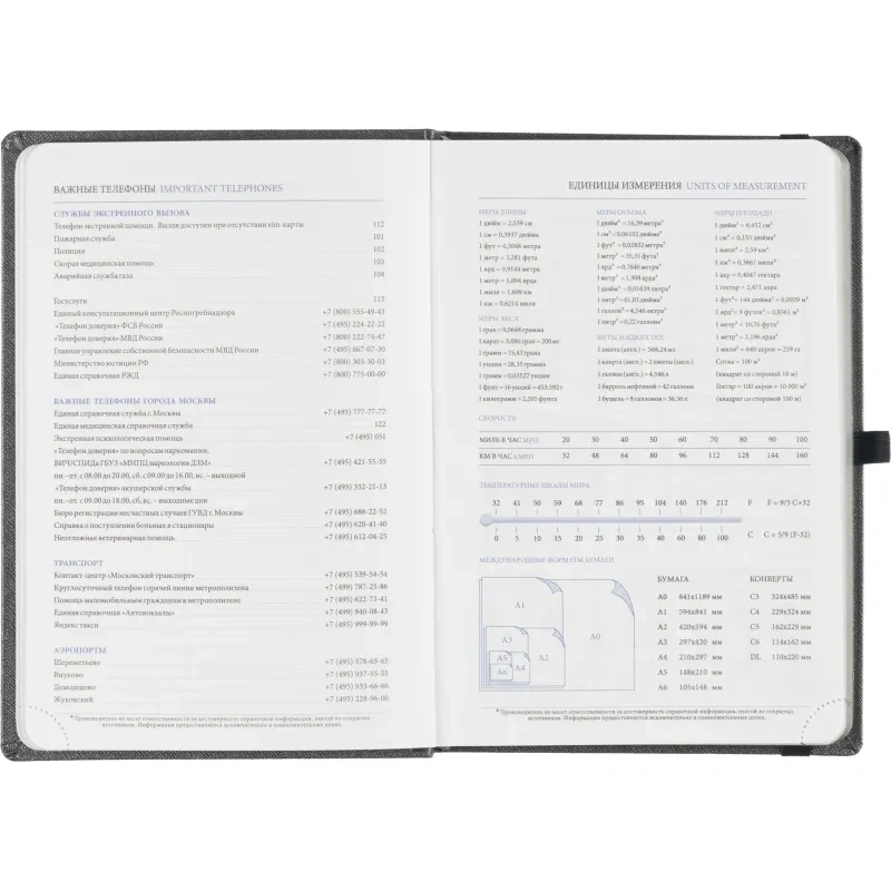 Ежедневник содержит информационно-справочный блок, включая личные данные, праздники, дни рождения и полезные сервисы. Блок также оснащен местами для записи регулярных платежей, важных телефонов и различных измерений. Перфорация уголка упрощает использование и добавляет удобства.