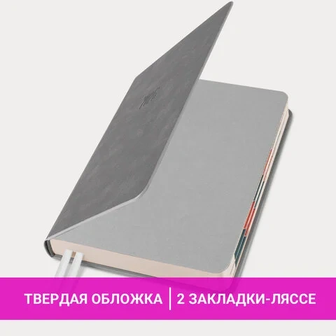 Внутренний блок включает 168 листов кремовой бумаги плотностью 70 г/м2. Каждая страничка имеет перфорированный угол. Благодаря небольшому формату B6 (125х173 мм) ежедневник удобно использовать как в офисе, так и на выездных деловых встречах. Твердая обложка стилизована под текстурную кожу. Материал обложки подходит для горячего тиснения.