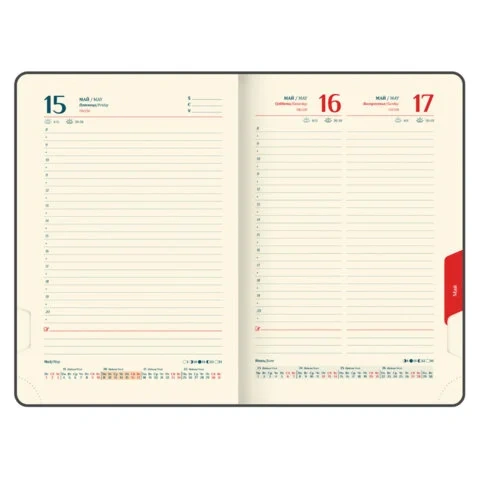 Внутренний блок включает 168 листов кремовой бумаги плотностью 70 г/м2. Каждая страничка имеет перфорированный угол. Благодаря небольшому формату B6 (125х173 мм) ежедневник удобно использовать как в офисе, так и на выездных деловых встречах. Твердая обложка стилизована под текстурную кожу. Материал обложки подходит для горячего тиснения.