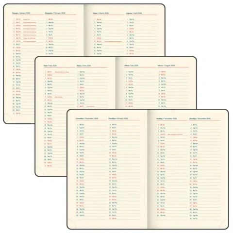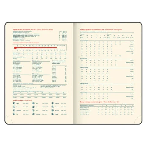 Дополнением является закладка-ляссе, с помощью которой при необходимости можно быстро открыть ежедневник на нужной странице, а также вырубка по месяцам. Помимо прочего, ежедневник снабжен обширным справочным материалом. В конце есть 6 страниц для записей и заметок.