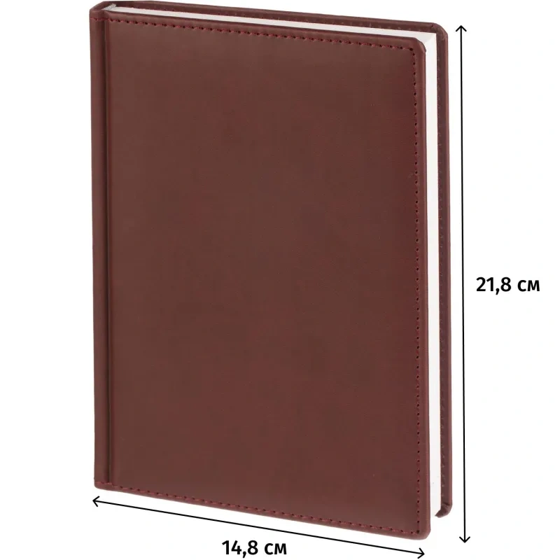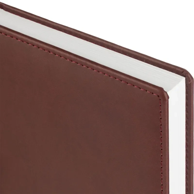 Данный ежедневник имеет формат A5, содержит 176 листов. Твёрдая обложка с поролоном, выполненная из высококачественной искуственной кожи бордового цвета, придает изделию элегантный и профессиональный вид. Страницы выполнены из белой офсетной бумаги плотностью 70 г/кв.м. Дизайн обложки: универсальный.