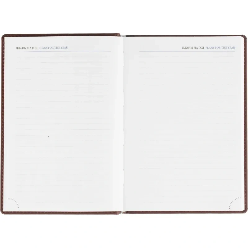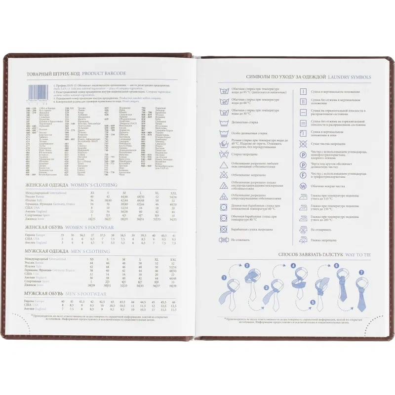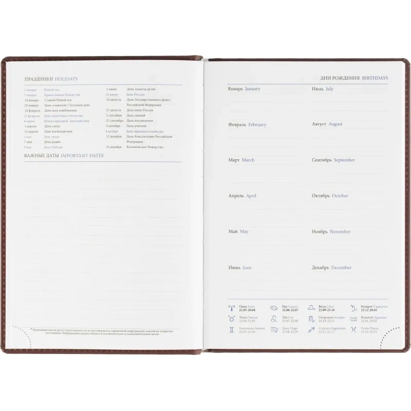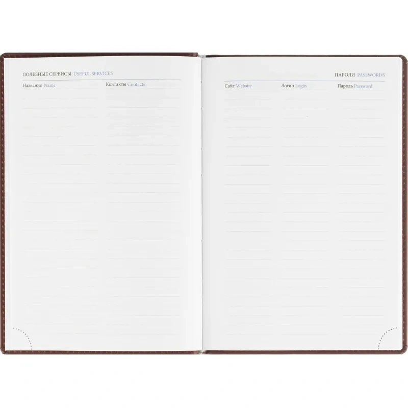 Ежедневник содержит информационно-справочный блок, включая личные данные, праздники, дни рождения и полезные сервисы. Блок также оснащен местами для записи регулярных платежей, важных телефонов и различных измерений. Перфорация уголка упрощает использование и добавляет удобства.