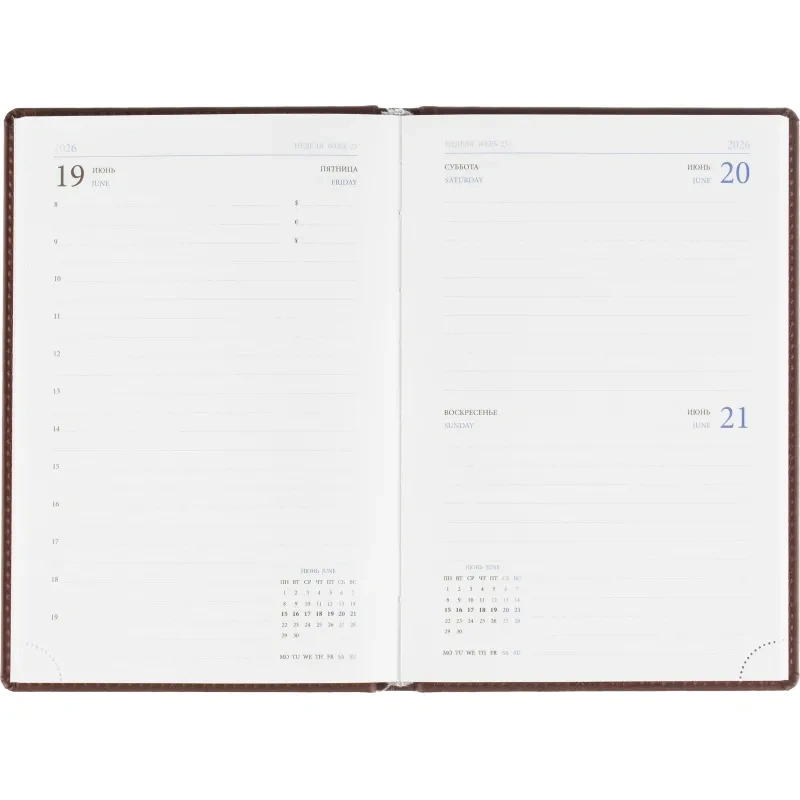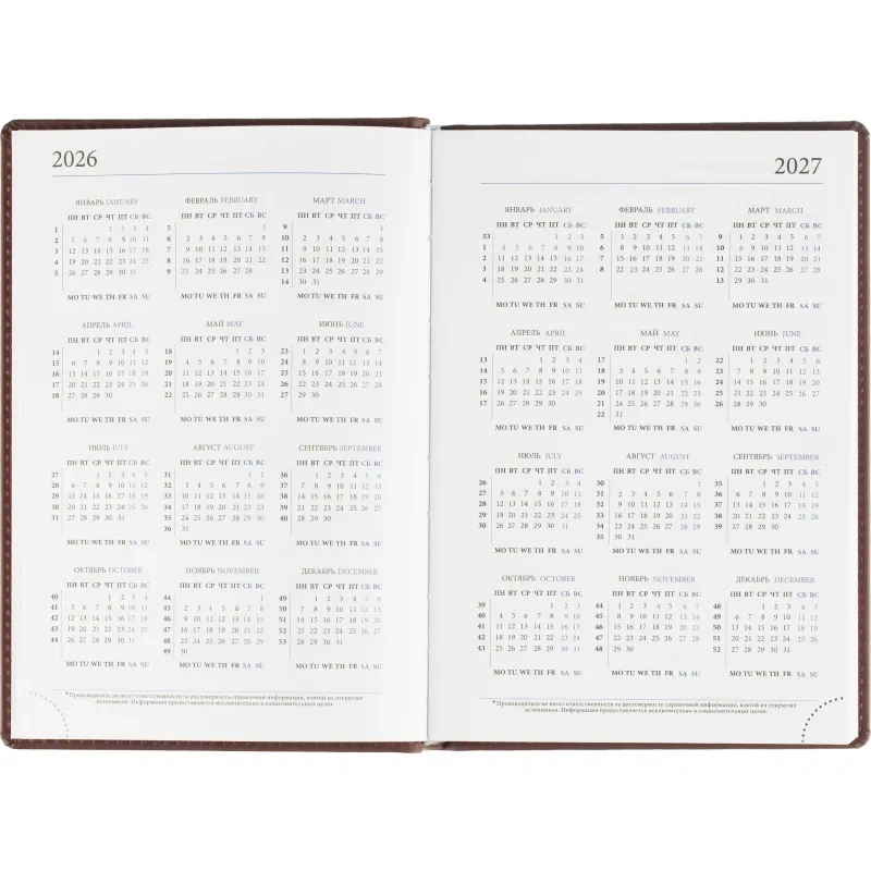 Среди дополнительных характеристик — ляссе серебристого цвета и уникальный блок, выполненный в двух цветах. На страницах предусмотрен календарь на 2026-2027 гг., что позволяет удобно планировать мероприятия и торжественные даты.