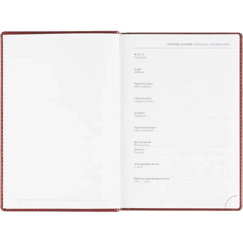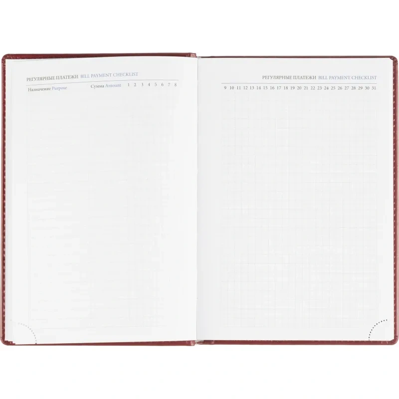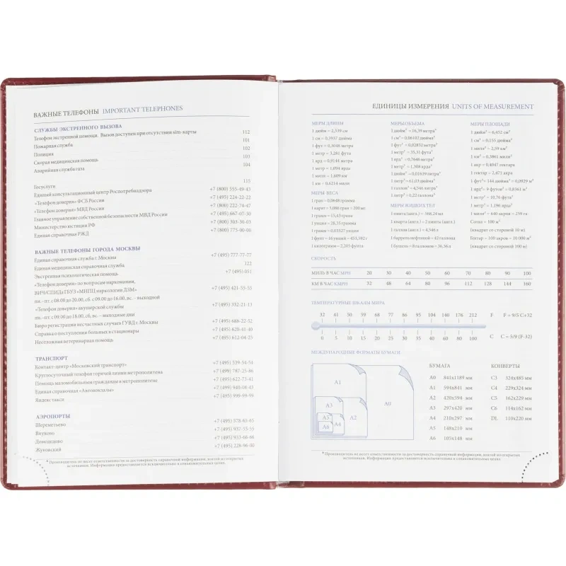 Ежедневник содержит информационно-справочный блок, включая личные данные, праздники, дни рождения и полезные сервисы. Блок также оснащён местами для записи регулярных платежей, важных телефонов и различных измерений. Перфорация уголка упрощает использование и добавляет удобства.