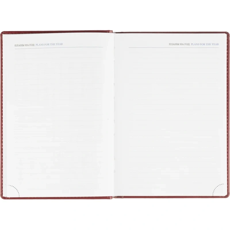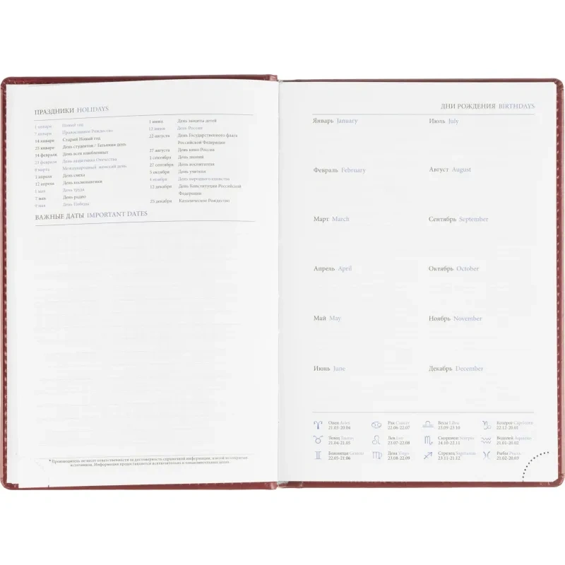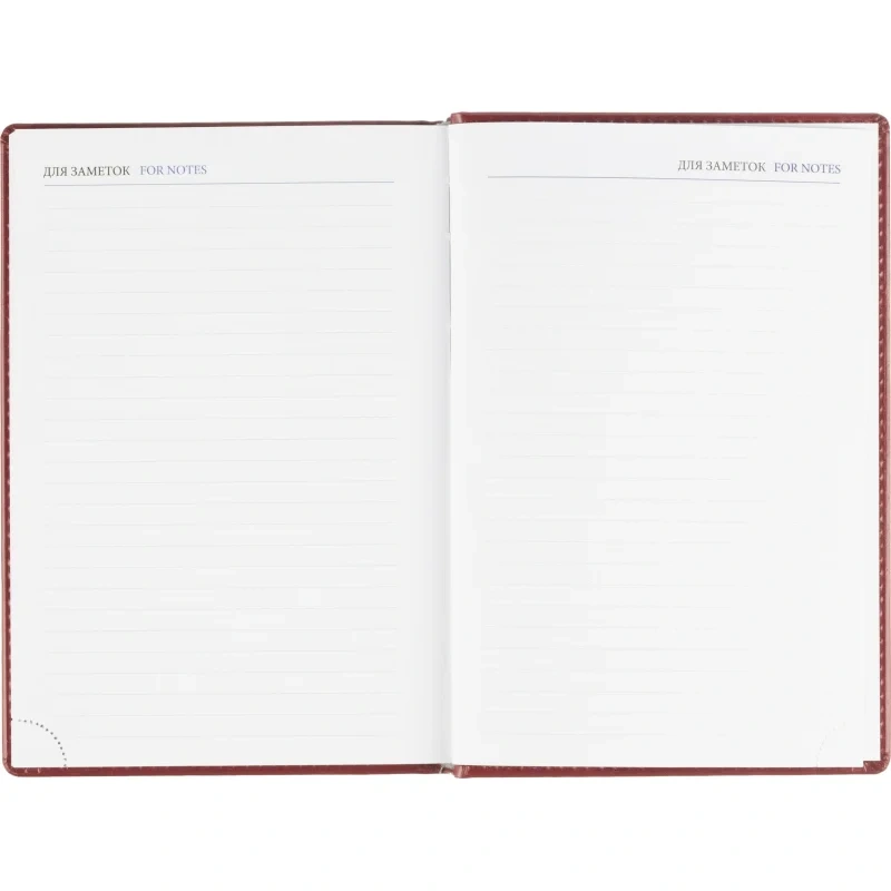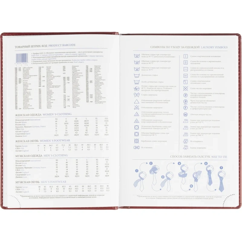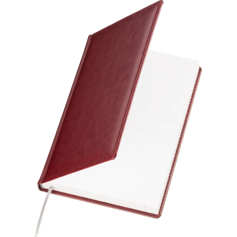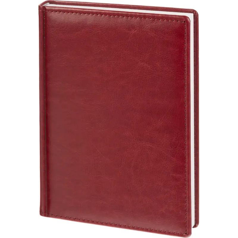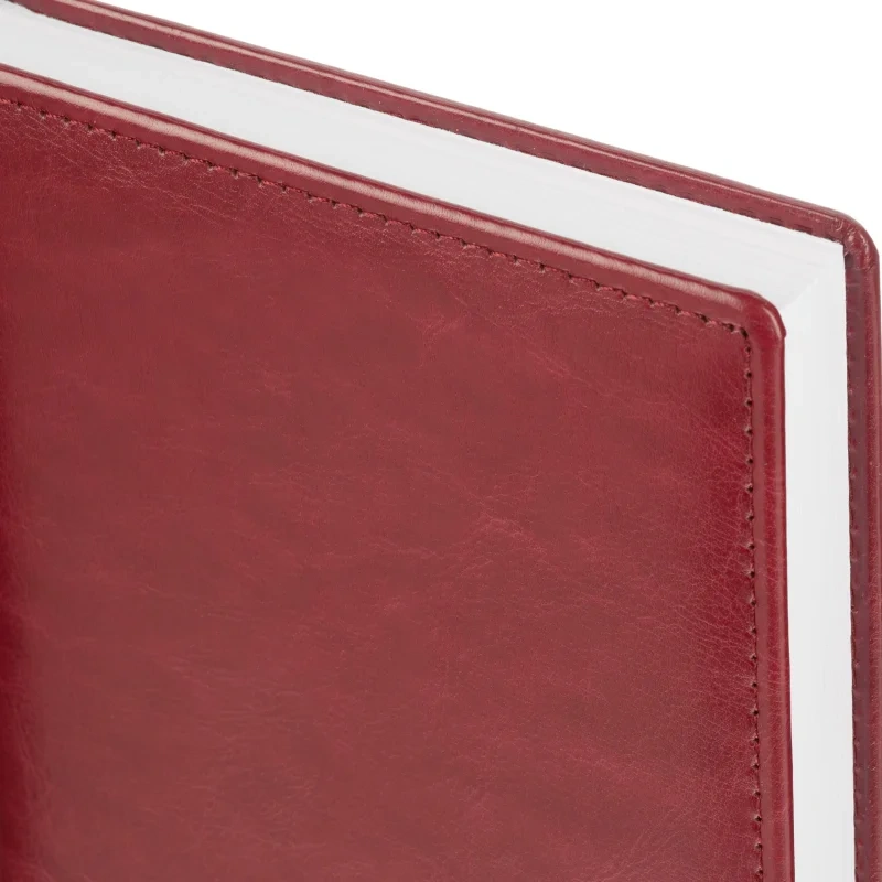 Данный ежедневник имеет формат A5, содержит 176 листов. Твёрдая обложка с поролоном, выполненная из высококачественной искусственной кожи бордового цвета, придаёт изделию элегантный и профессиональный вид. Страницы выполнены из белой офсетной бумаги плотностью 70 г/кв.м. Дизайн обложки: универсальный.
