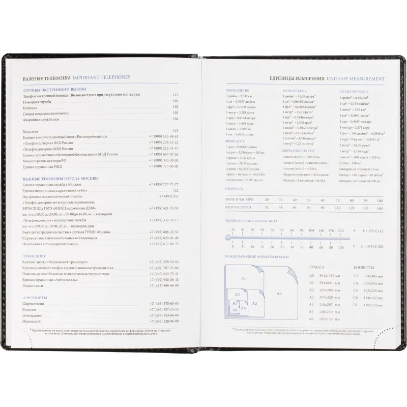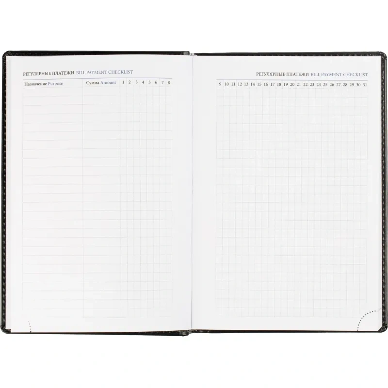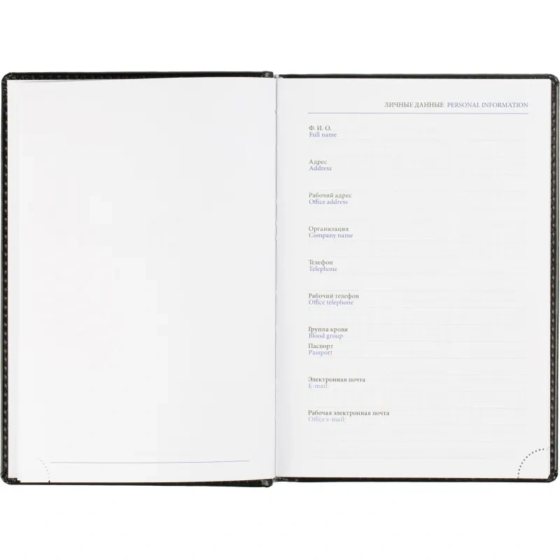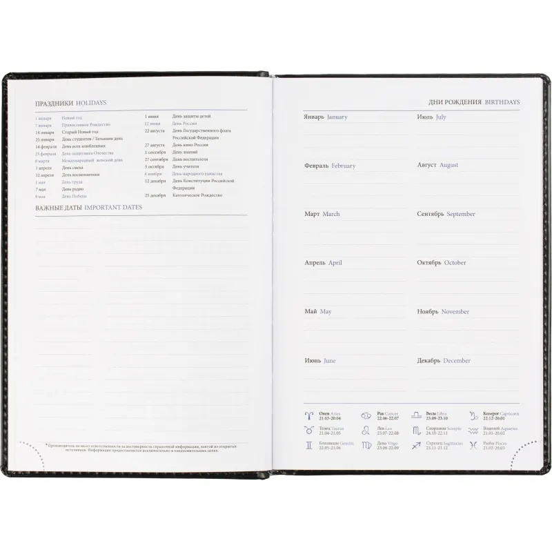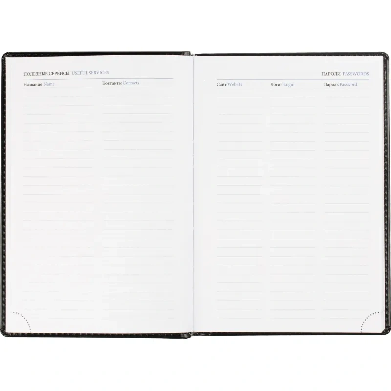 Ежедневник содержит информационно-справочный блок, включая личные данные, праздники, дни рождения и полезные сервисы. Блок также оснащен местами для записи регулярных платежей, важных телефонов и различных измерений. Перфорация уголка упрощает использование и добавляет удобства.