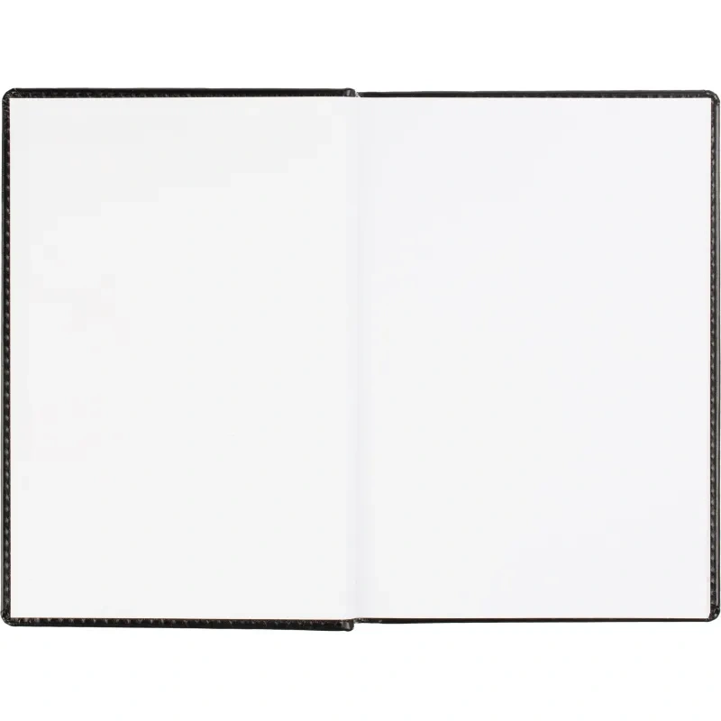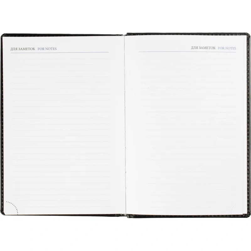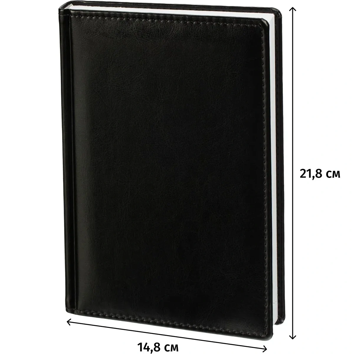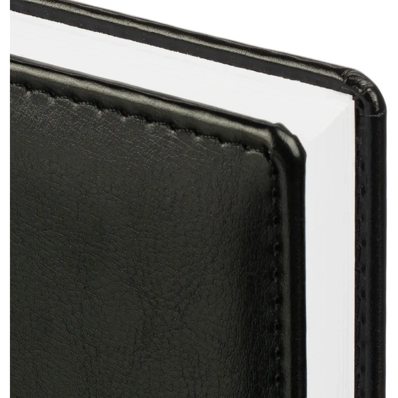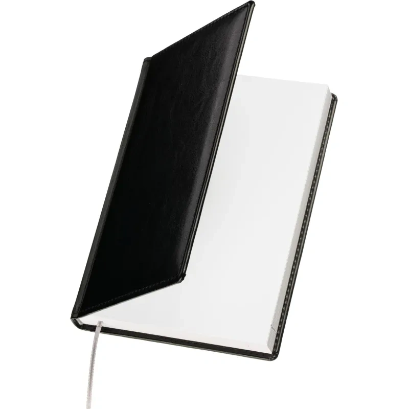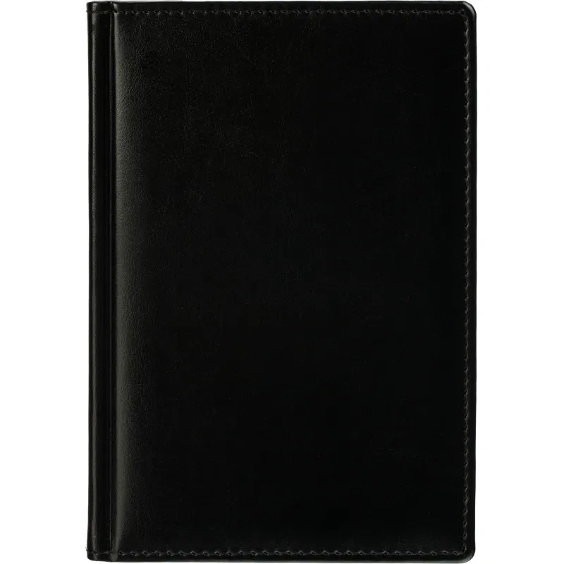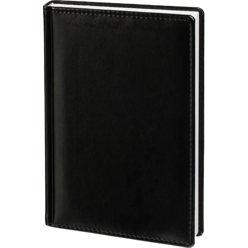 Данный ежедневник имеет формат A5, содержит 176 листов. Твёрдая обложка с поролоном, выполненная из высококачественной искуственной кожи чёрного цвета, придает изделию элегантный и профессиональный вид. Страницы выполнены из белой офсетной бумаги плотностью 70 г/кв.м. Дизайн обложки: универсальный.
