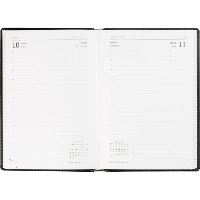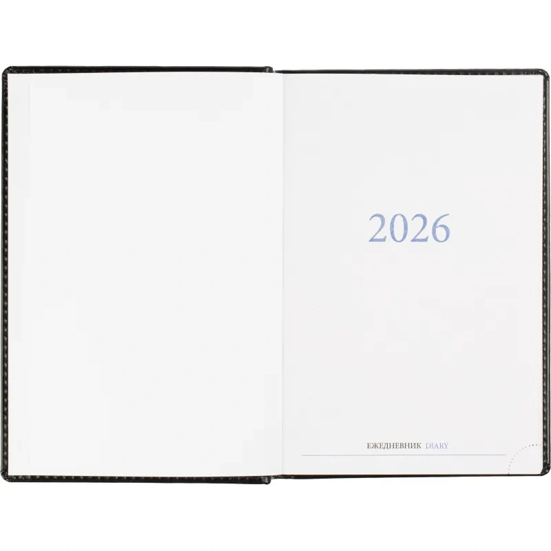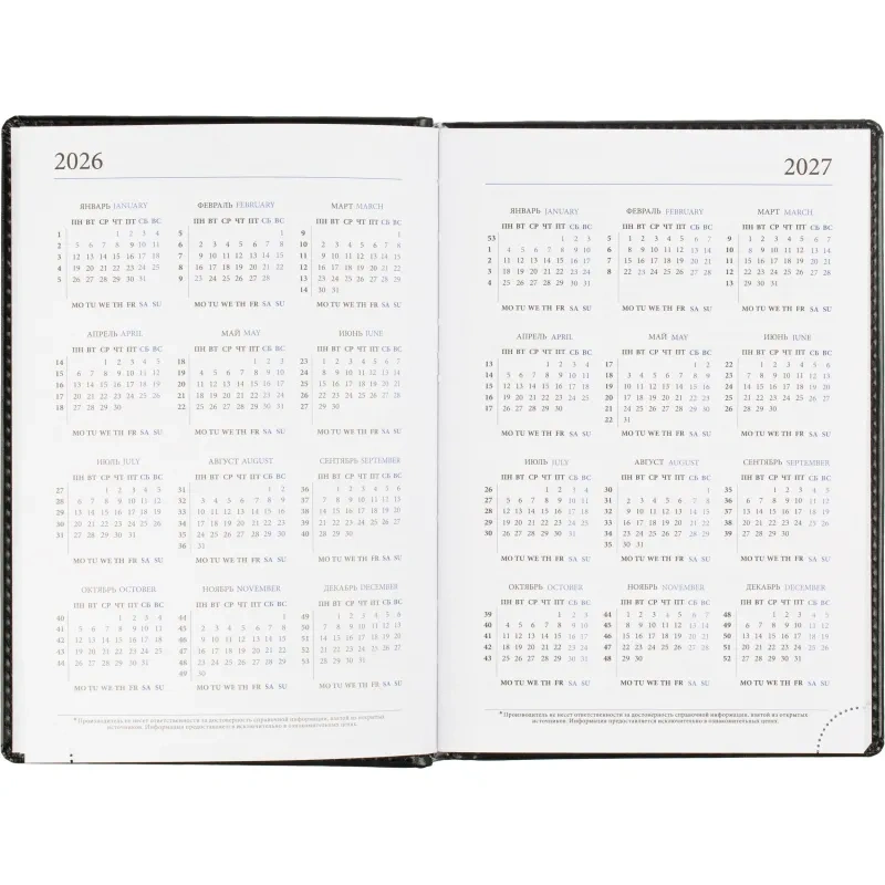 Среди дополнительных характеристик — ляссе серебристого цвета и уникальный блок, выполненный в двух цветах. На страницах предусмотрен календарь на 2026-2027 гг., что позволяет удобно планировать мероприятия и торжественные даты.