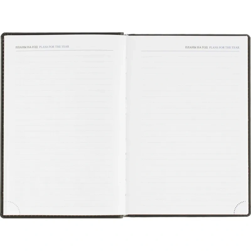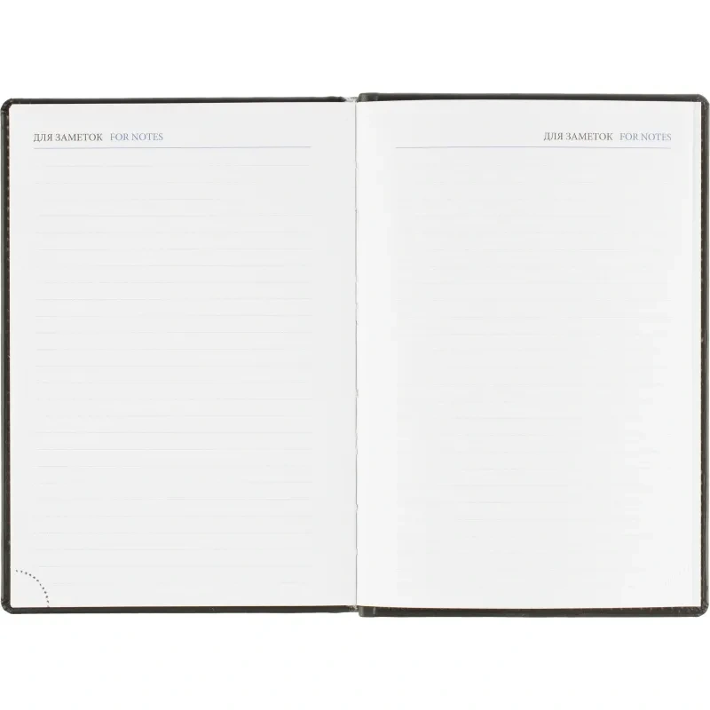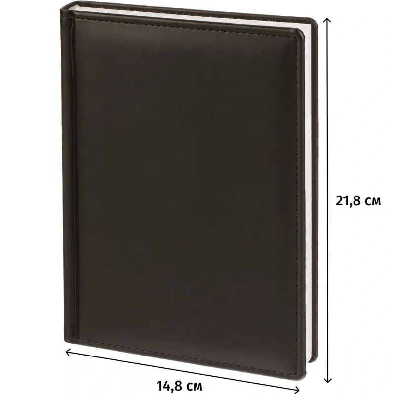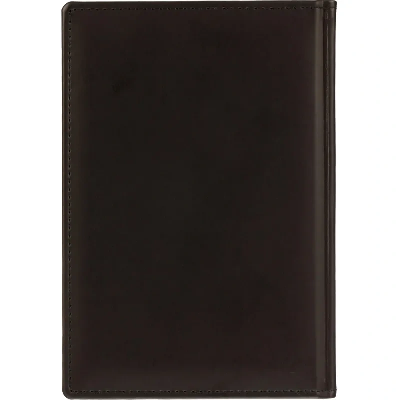 Данный ежедневник имеет формат A5, содержит 176 листов. Твёрдая обложка с поролоном, выполненная из высококачественной искуственной кожи чёрного цвета, придает изделию элегантный и профессиональный вид. Страницы выполнены из белой офсетной бумаги плотностью 70 г/кв.м. Дизайн обложки: универсальный.