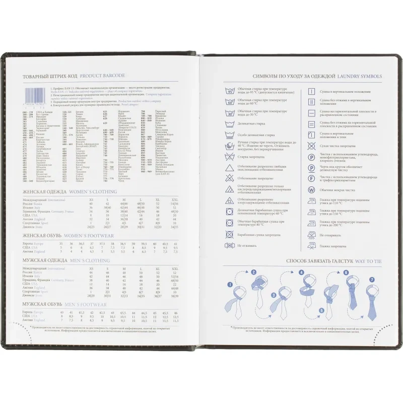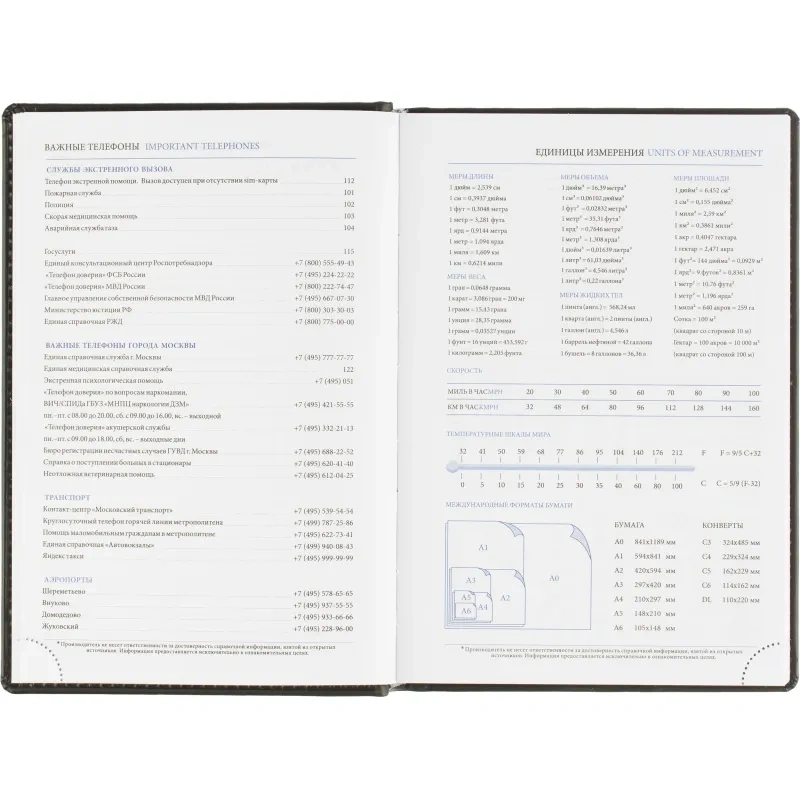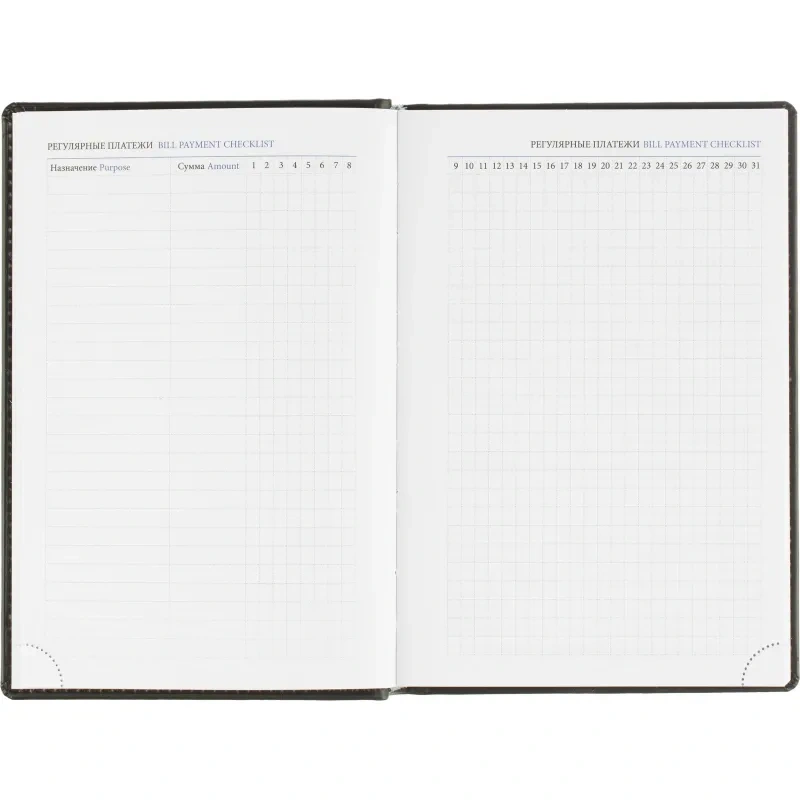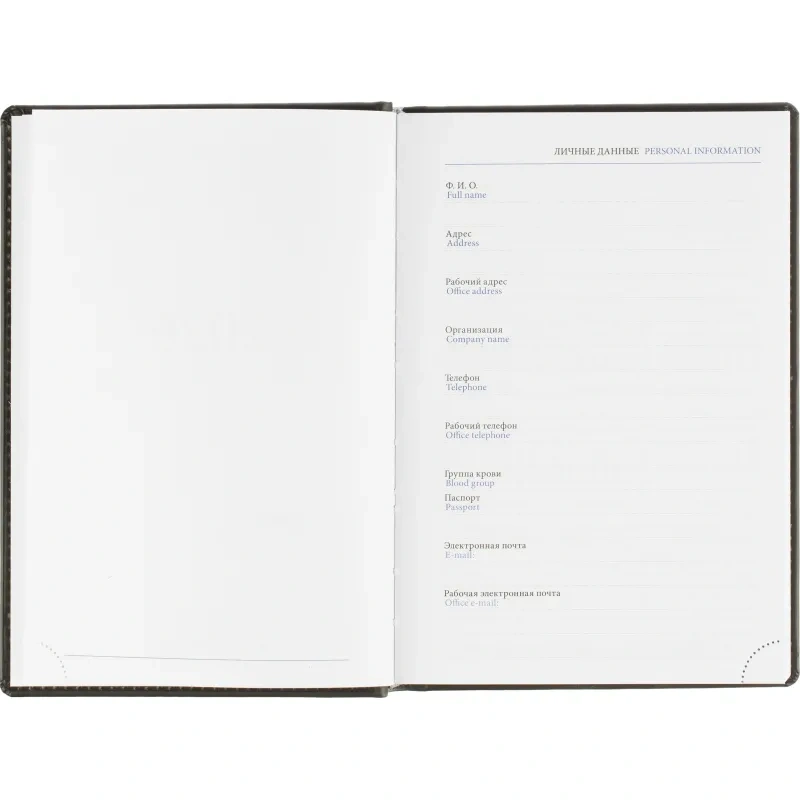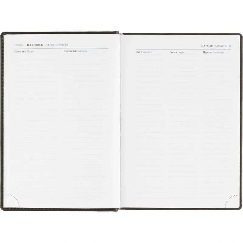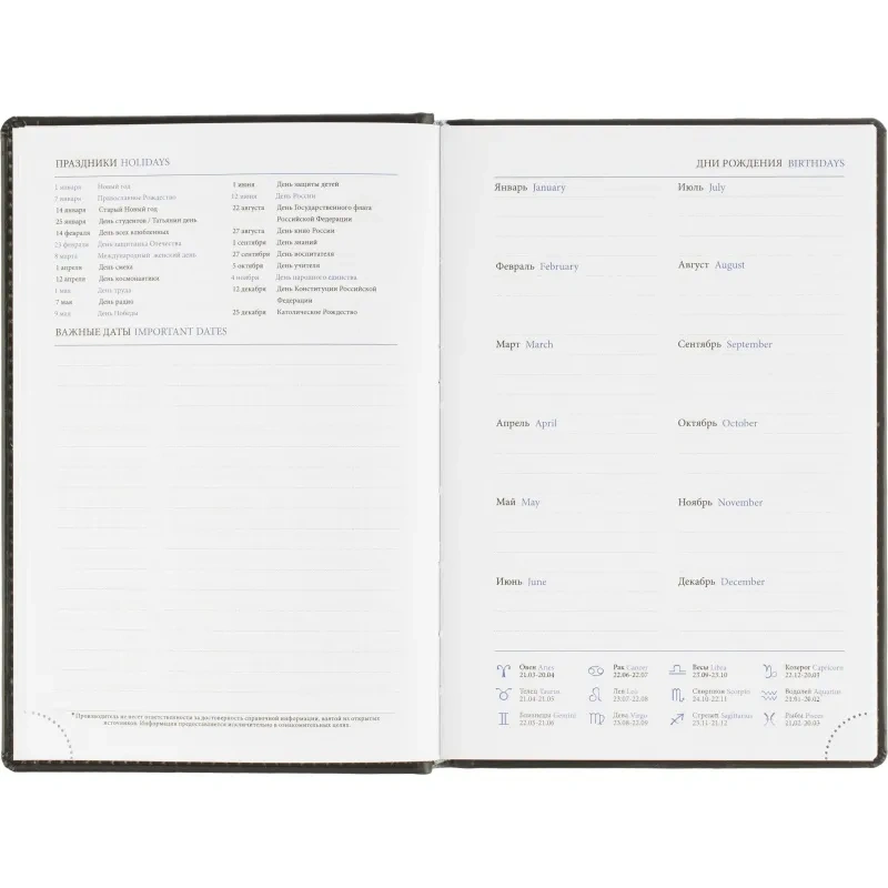 Ежедневник содержит информационно-справочный блок, включая личные данные, праздники, дни рождения и полезные сервисы. Блок также оснащен местами для записи регулярных платежей, важных телефонов и различных измерений. Перфорация уголка упрощает использование и добавляет удобства.