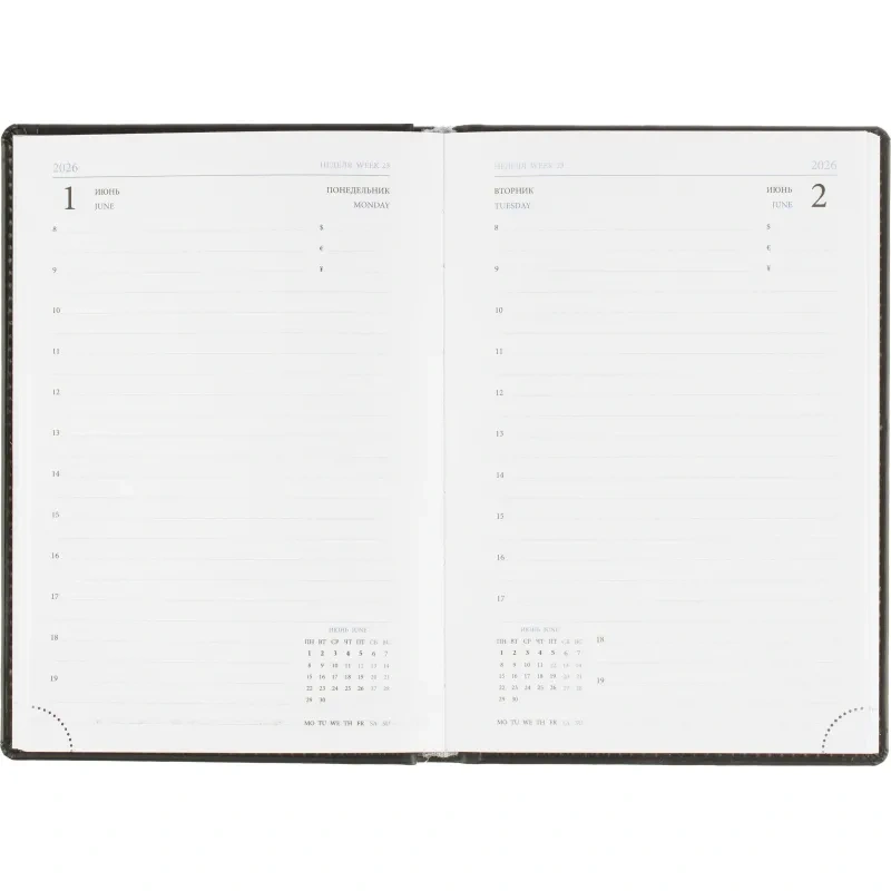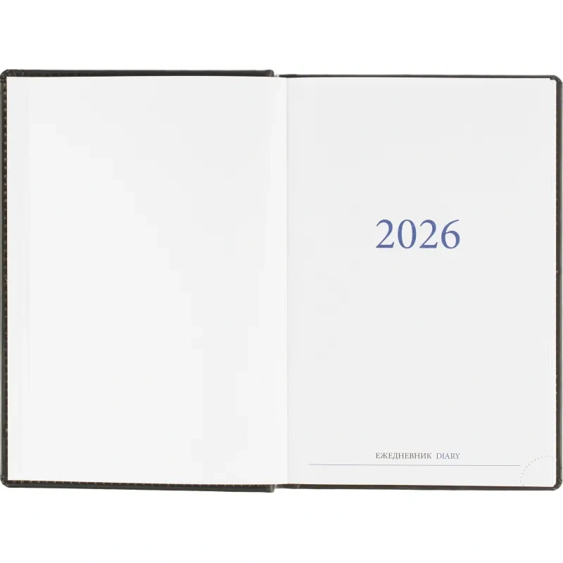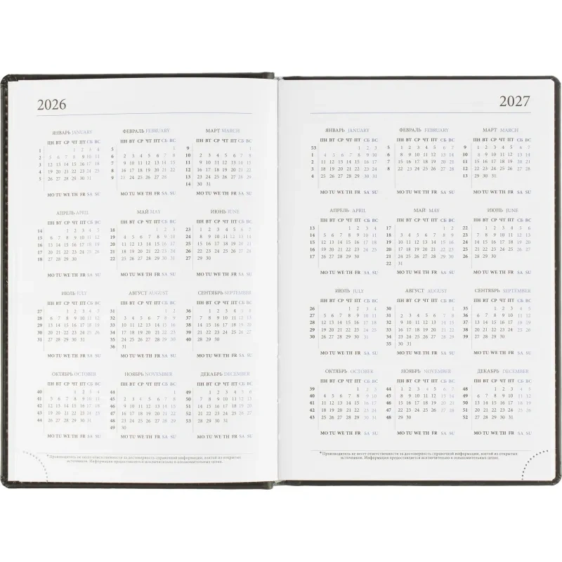 Среди дополнительных характеристик — ляссе серебристого цвета и уникальный блок, выполненный в двух цветах. На страницах предусмотрен календарь на 2026-2027 гг., что позволяет удобно планировать мероприятия и торжественные даты.