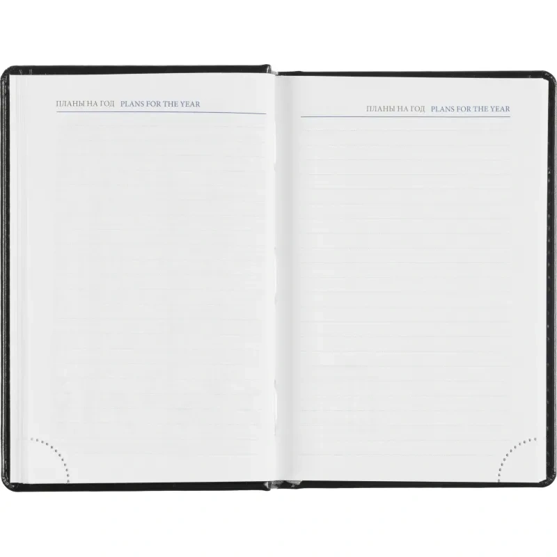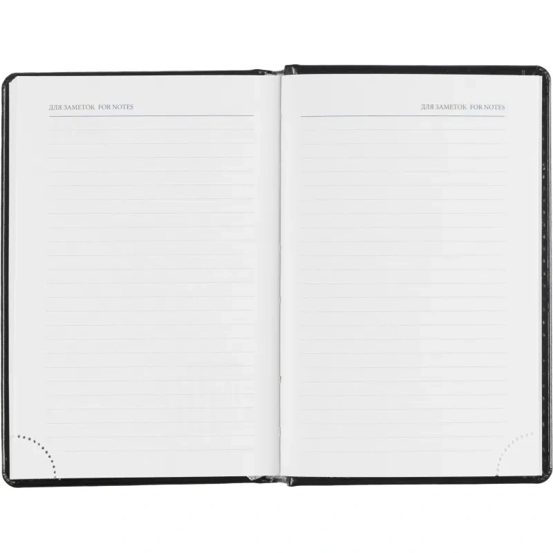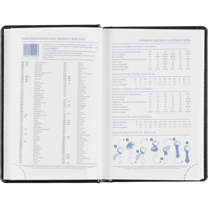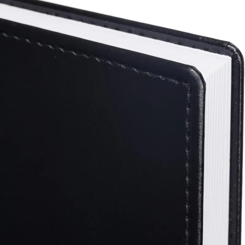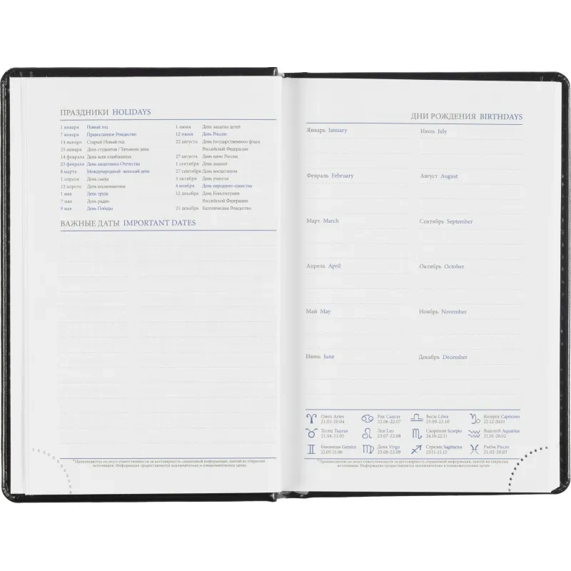 Данный ежедневник имеет формат A6, содержит 168 листов. Твёрдая обложка с поролоном, выполненная из высококачественной искуственной кожи чёрного цвета, придает изделию элегантный и профессиональный вид. Страницы выполнены из белой офсетной бумаги плотностью 70 г/кв.м. Дизайн обложки: универсальный.