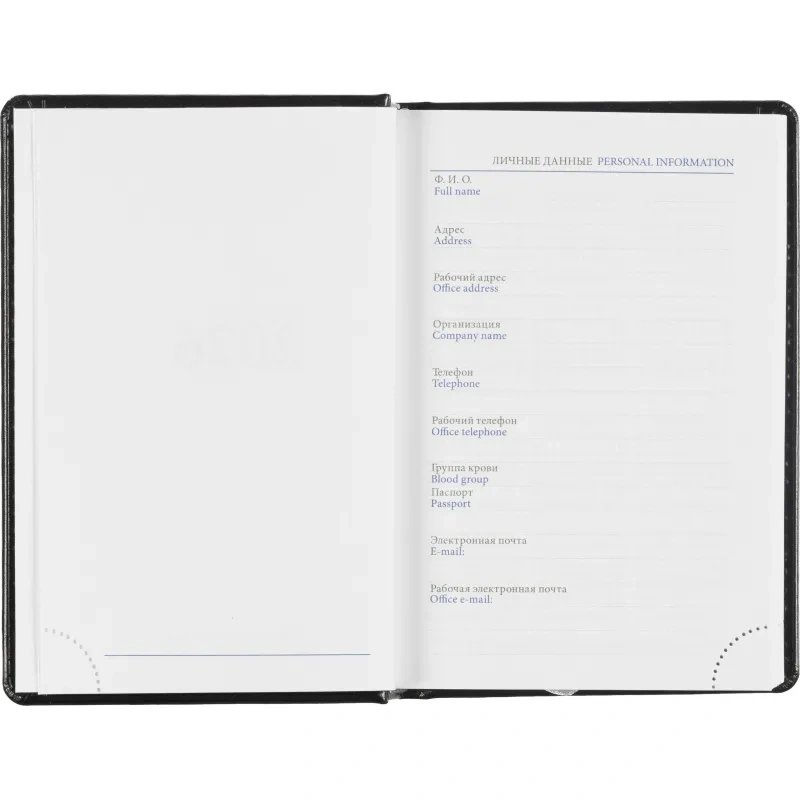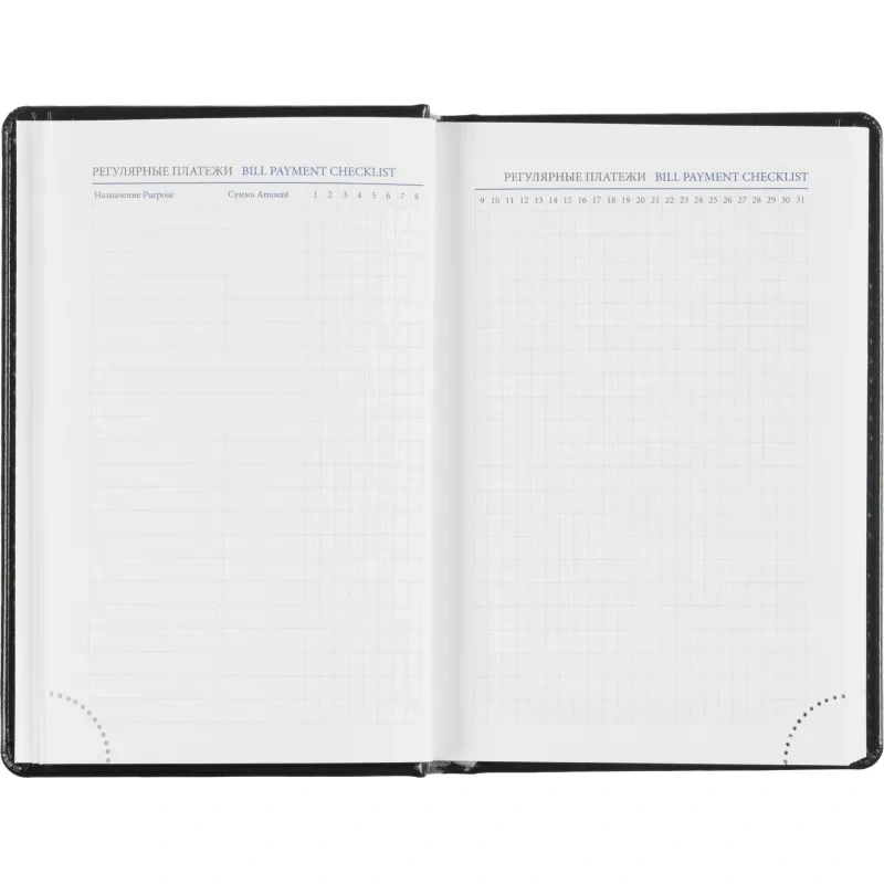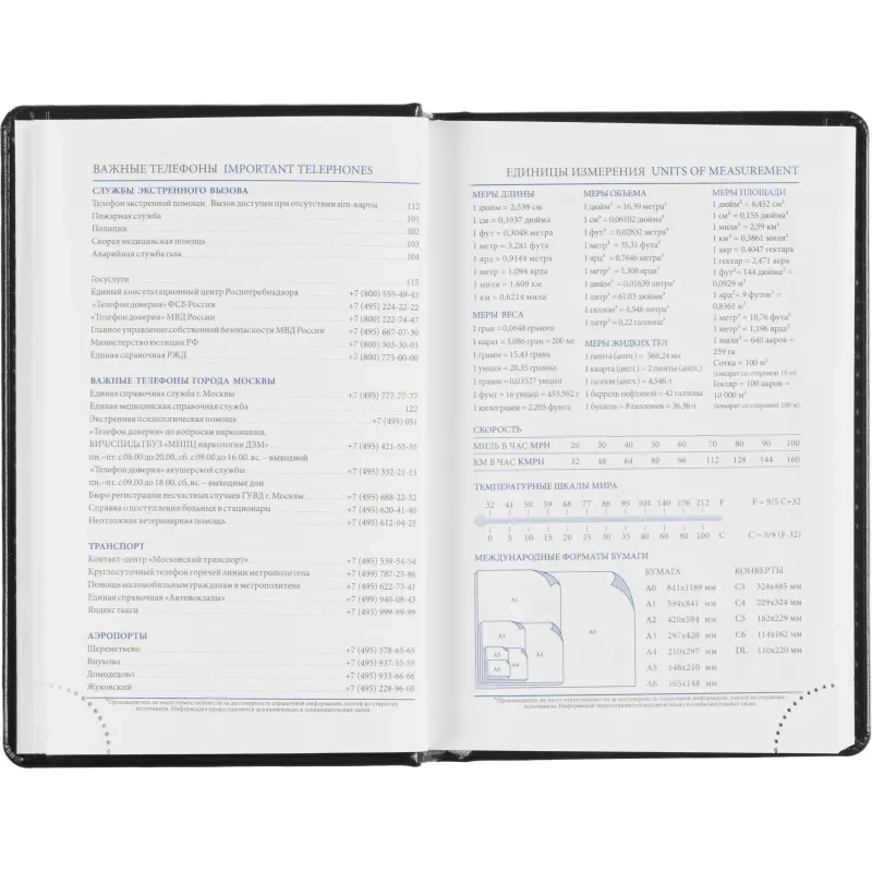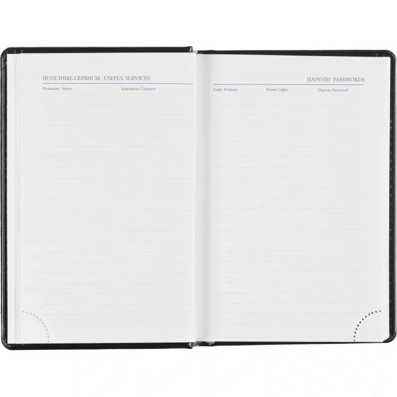 Ежедневник содержит информационно-справочный блок, включая личные данные, праздники, дни рождения и полезные сервисы. Блок также оснащен местами для записи регулярных платежей, важных телефонов и различных измерений. Перфорация уголка упрощает использование и добавляет удобства.