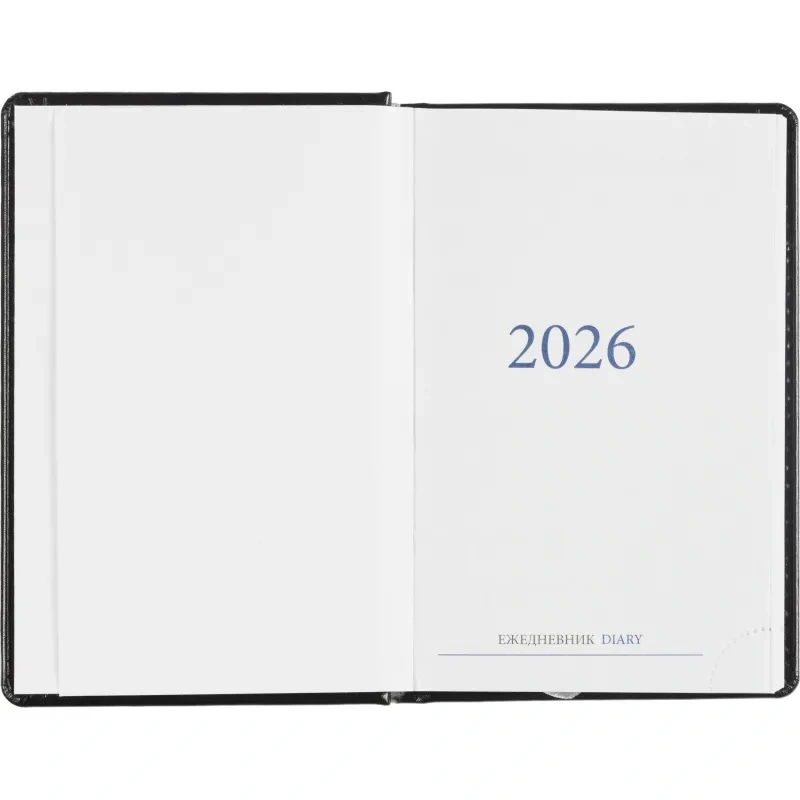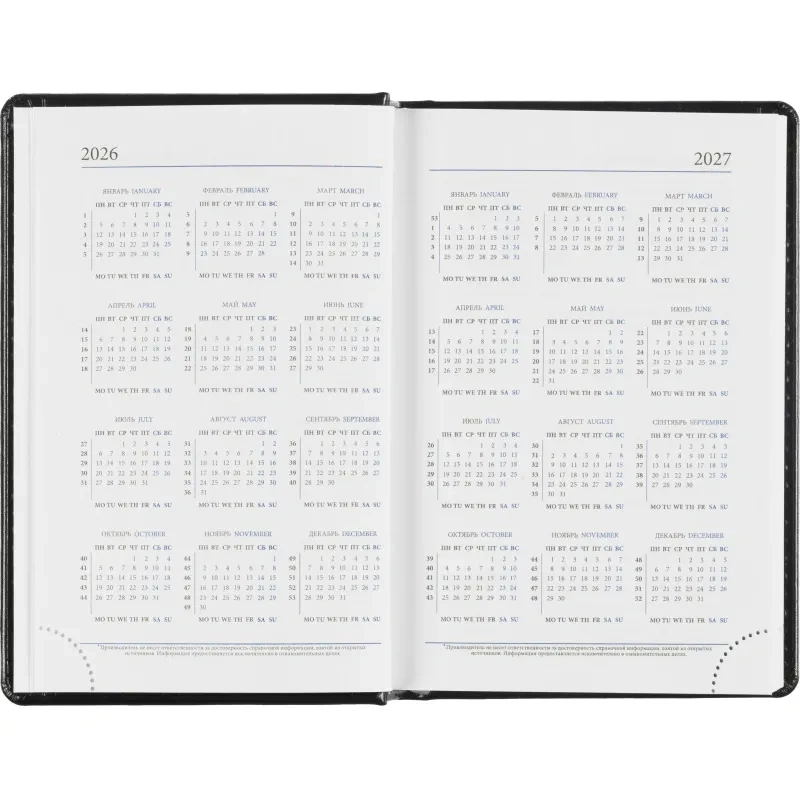 Среди дополнительных характеристик — ляссе серебристого цвета и уникальный блок, выполненный в двух цветах. На страницах предусмотрен календарь на 2026-2027 гг., что позволяет удобно планировать мероприятия и торжественные даты.