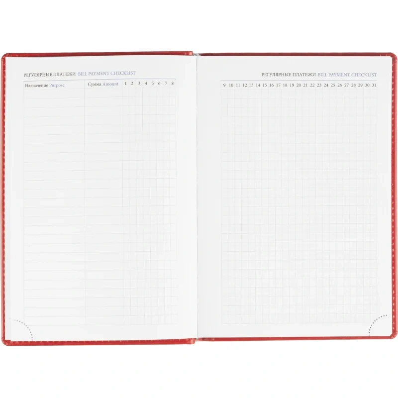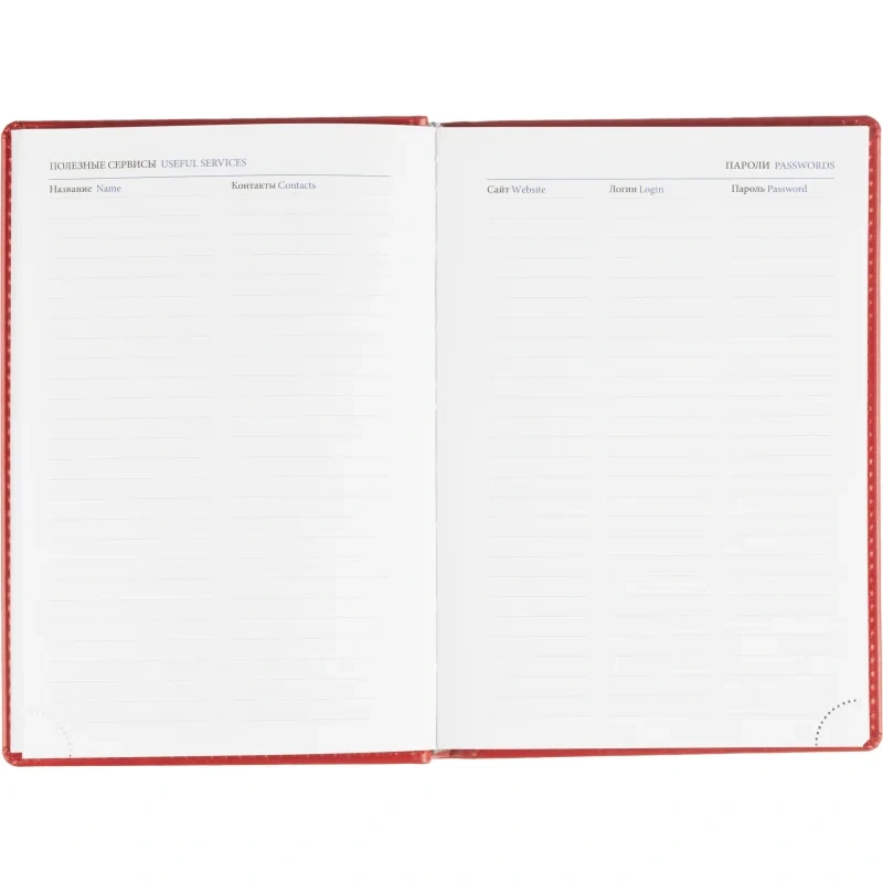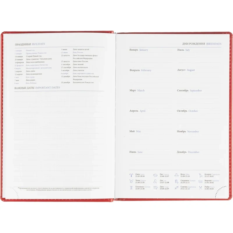 Ежедневник содержит информационно-справочный блок, включая личные данные, праздники, дни рождения и полезные сервисы. Блок также оснащён местами для записи регулярных платежей, важных телефонов и различных измерений. Перфорация уголка упрощает использование и добавляет удобства.