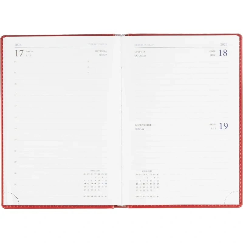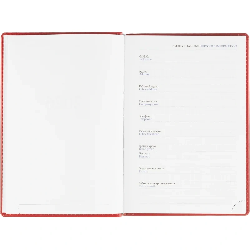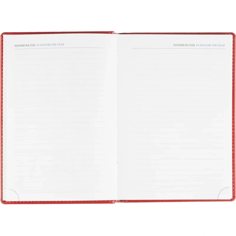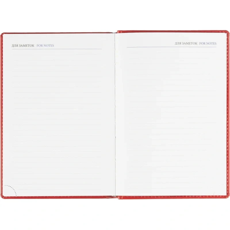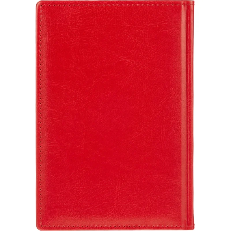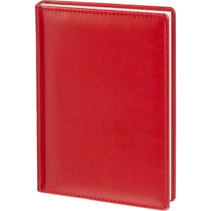 Данный ежедневник имеет формат A5, содержит 176 листов. Твёрдая обложка с поролоном, выполненная из высококачественной искуственной кожи красного цвета, придаёт изделию элегантный и профессиональный вид. Страницы выполнены из белой офсетной бумаги плотностью 70 г/кв.м. Дизайн обложки: универсальный.