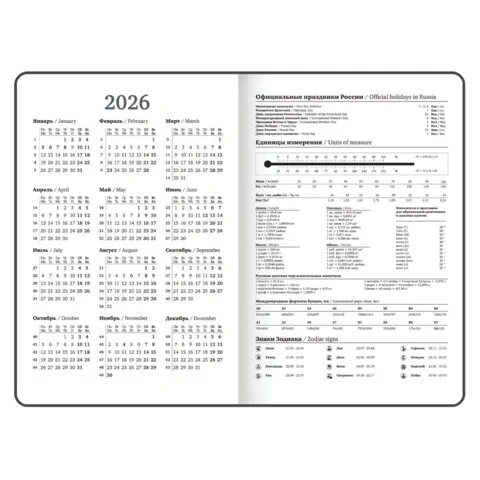 Внутренний блок состоит из 160 листов офсетной бумаги плотностью 60 г/м2. Обложка 7БЦ (твердый переплет с матовой пленкой) обеспечивает долговечность при активном использовании. Благодаря стандартному формату А5 (145х203 мм) датированный ежедневник удобно использовать как в офисе, так и на выездных деловых встречах.