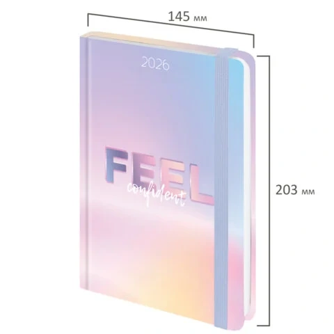 Внутренний блок состоит из 160 листов офсетной бумаги плотностью 60 г/м2. Обложка 7БЦ (твердый переплет с матовой пленкой) обеспечивает долговечность при активном использовании. Благодаря стандартному формату А5 (145х203 мм) датированный ежедневник удобно использовать как в офисе, так и на выездных деловых встречах.