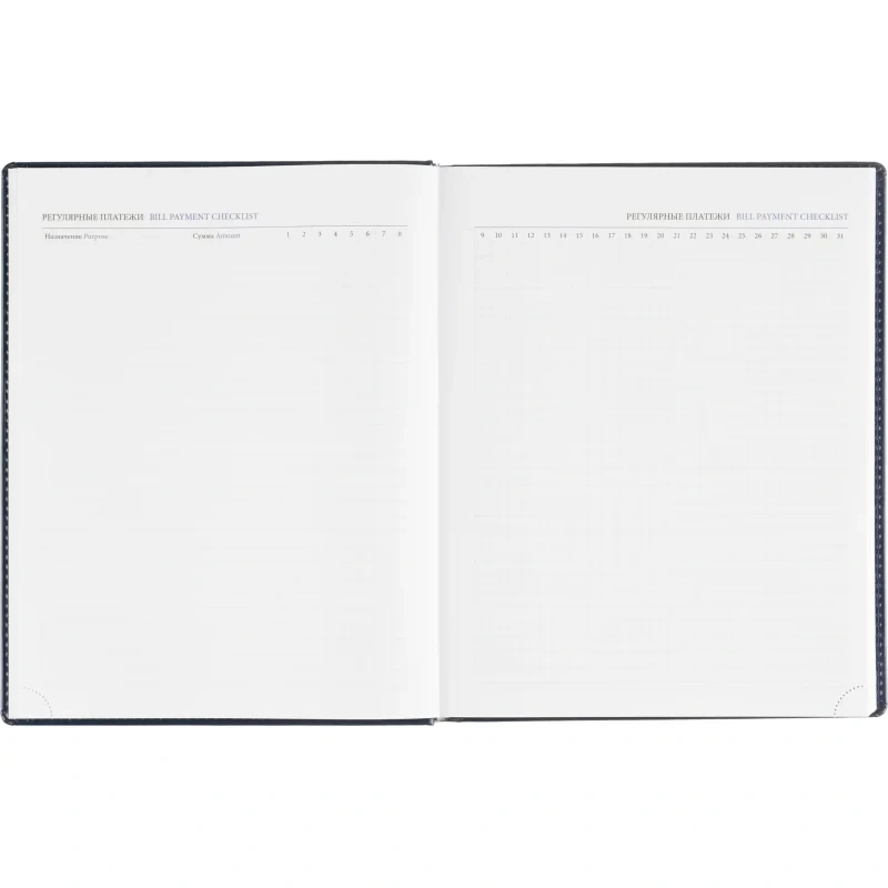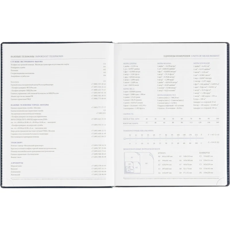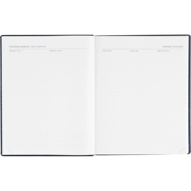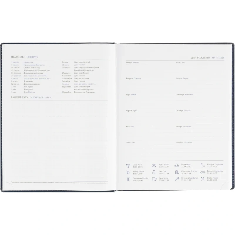 Ежедневник содержит информационно-справочный блок, включая личные данные, праздники, дни рождения и полезные сервисы. Блок также оснащен местами для записи регулярных платежей, важных телефонов и различных измерений. Перфорация уголка упрощает использование и добавляет удобства.