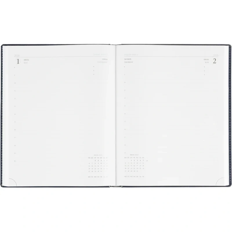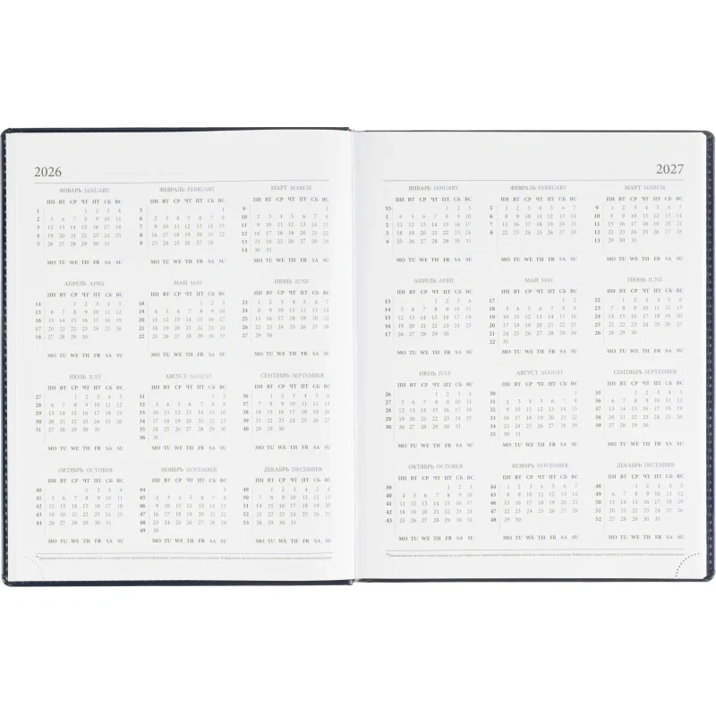 Среди дополнительных характеристик — ляссе серебристого цвета и уникальный блок, выполненный в двух цветах. На страницах предусмотрен календарь на 2026-2027 гг., что позволяет удобно планировать мероприятия и торжественные даты.