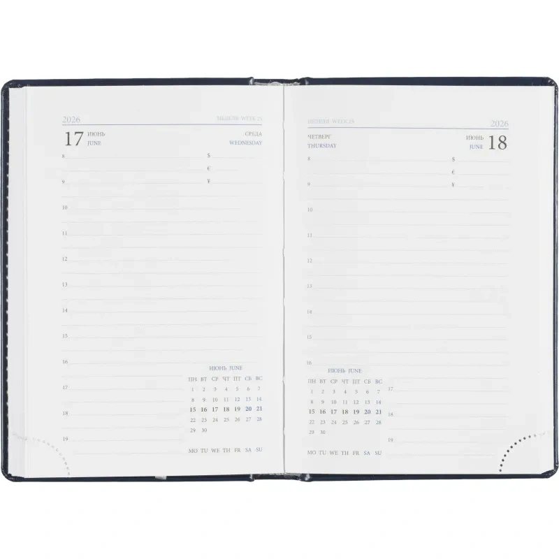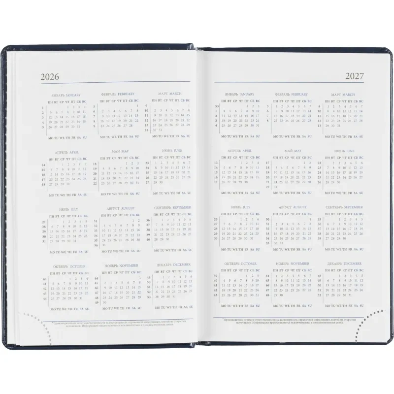 Среди дополнительных характеристик — ляссе серебристого цвета и уникальный блок, выполненный в двух цветах. На страницах предусмотрен календарь на 2026-2027 гг., что позволяет удобно планировать мероприятия и торжественные даты.