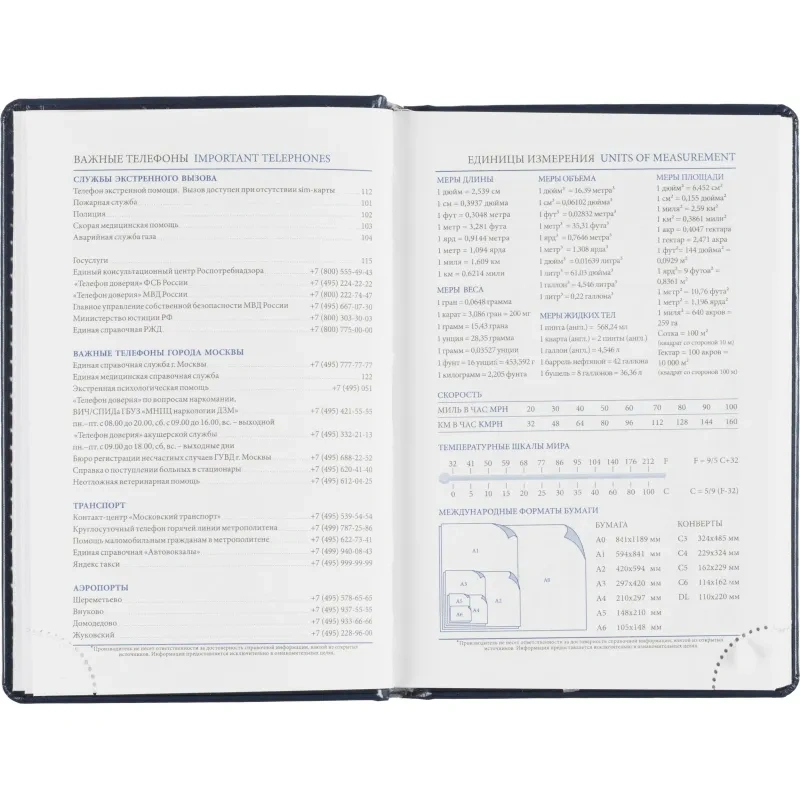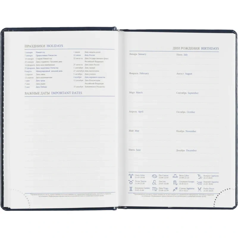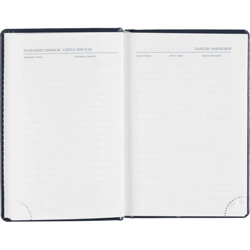 Ежедневник содержит информационно-справочный блок, включая личные данные, праздники, дни рождения и полезные сервисы. Блок также оснащен местами для записи регулярных платежей, важных телефонов и различных измерений. Перфорация уголка упрощает использование и добавляет удобства.