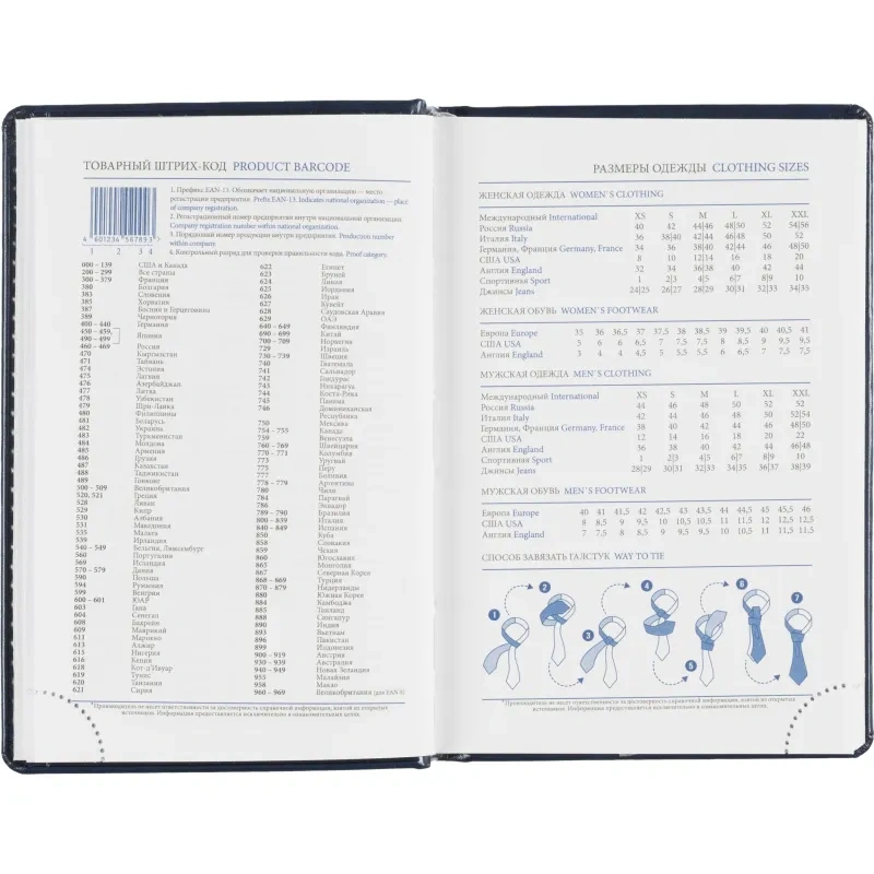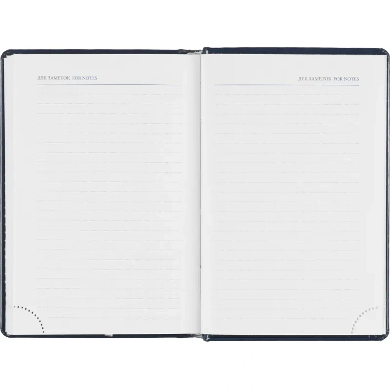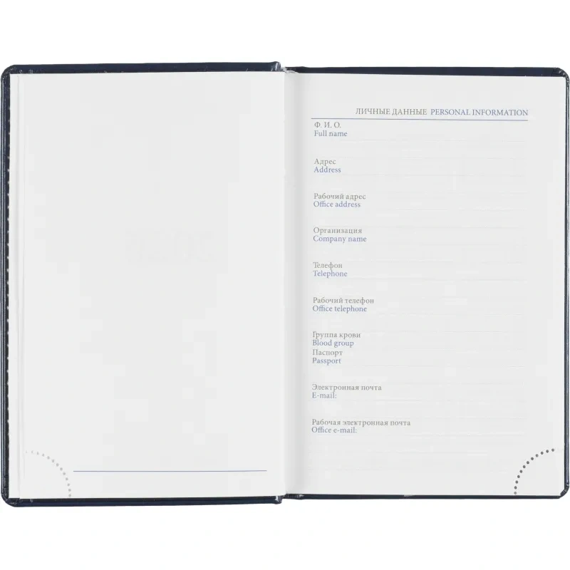 Данный ежедневник имеет формат A6, содержит 168 листов. Твёрдая обложка с поролоном, выполненная из высококачественной искуственной кожи синего цвета, придает изделию элегантный и профессиональный вид. Страницы выполнены из белой офсетной бумаги плотностью 70 г/кв.м. Дизайн обложки: универсальный.