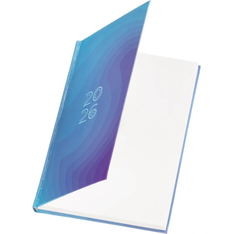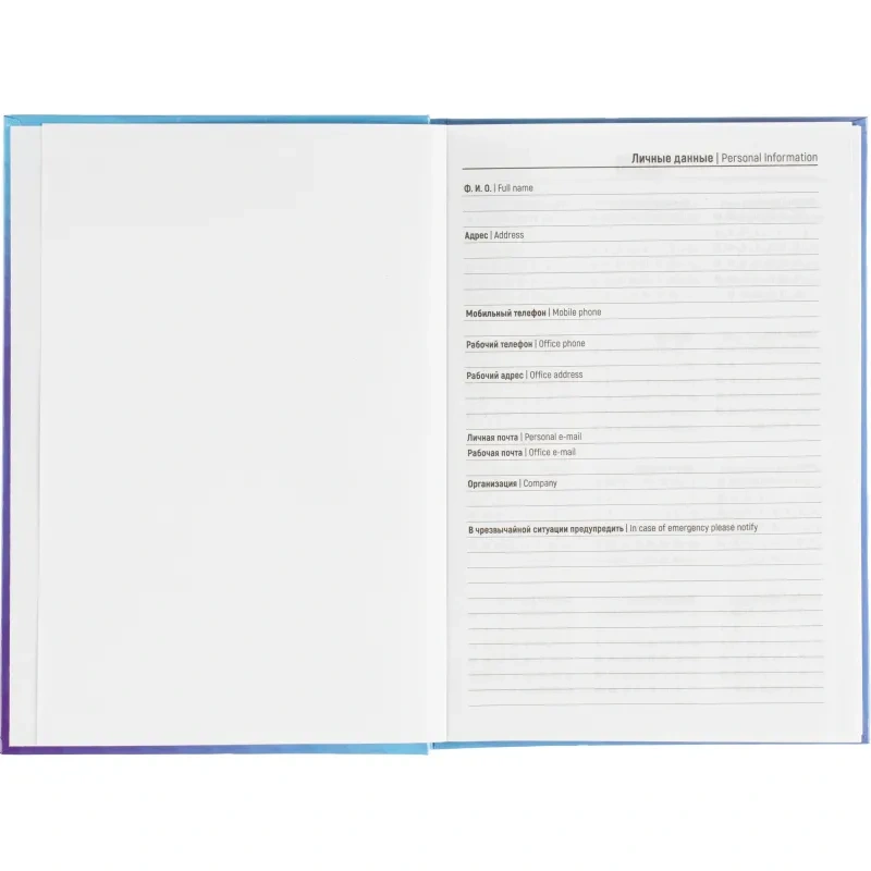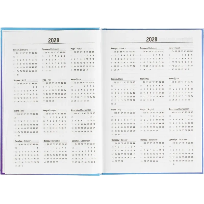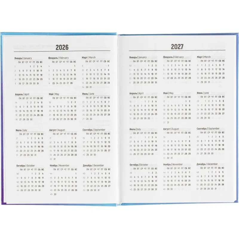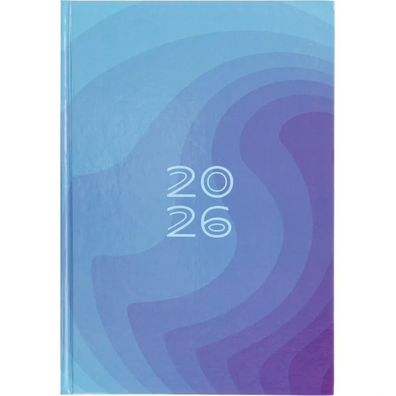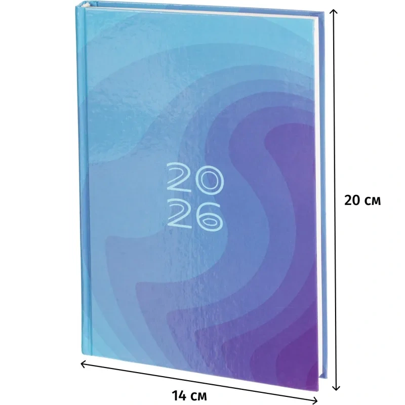 Ежедневник содержит информационно-справочный блок, включая личные данные и календарь на 2026-2029 годы. Он рассчитан на заполнение в течение одного года. В ежедневнике нет петли для ручки.