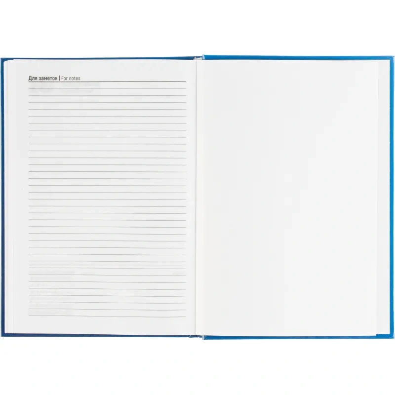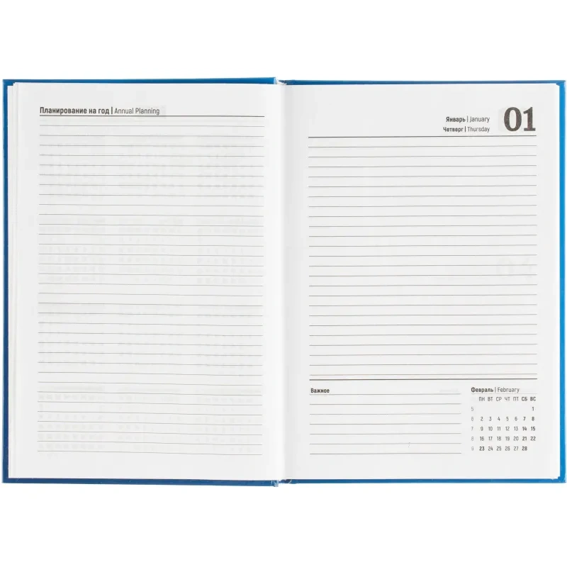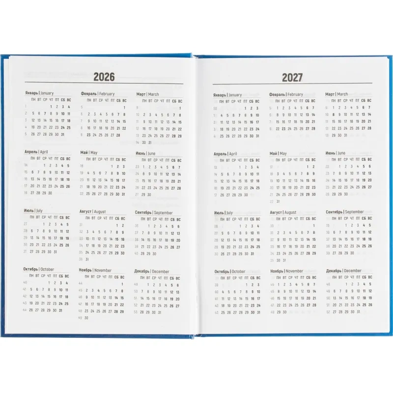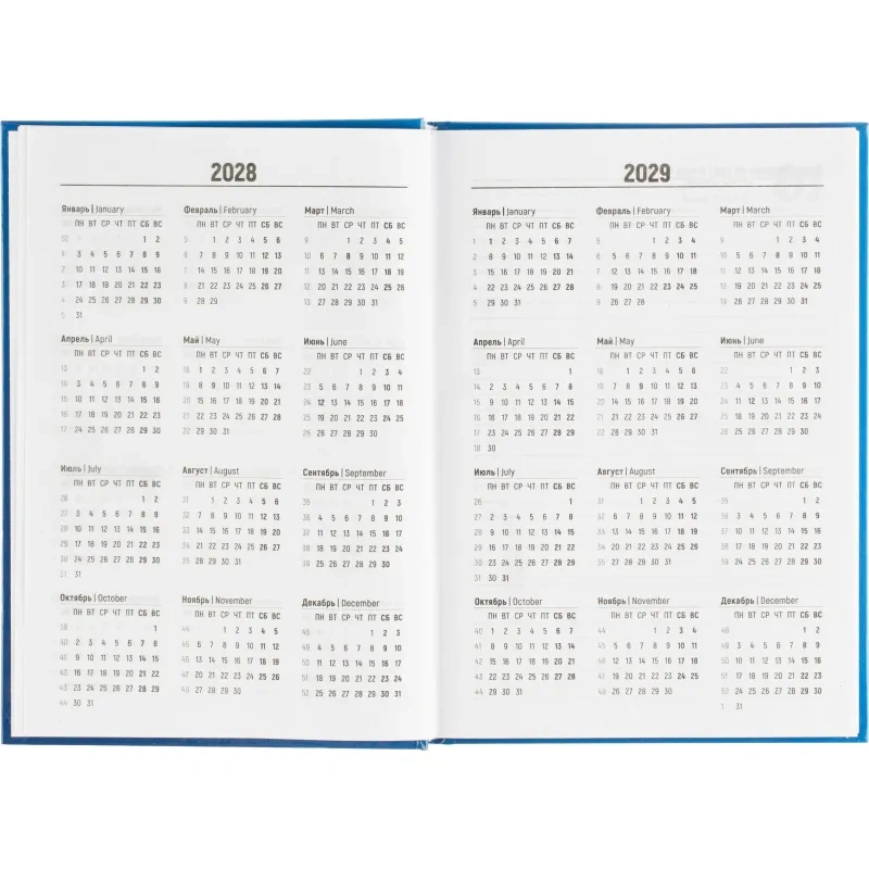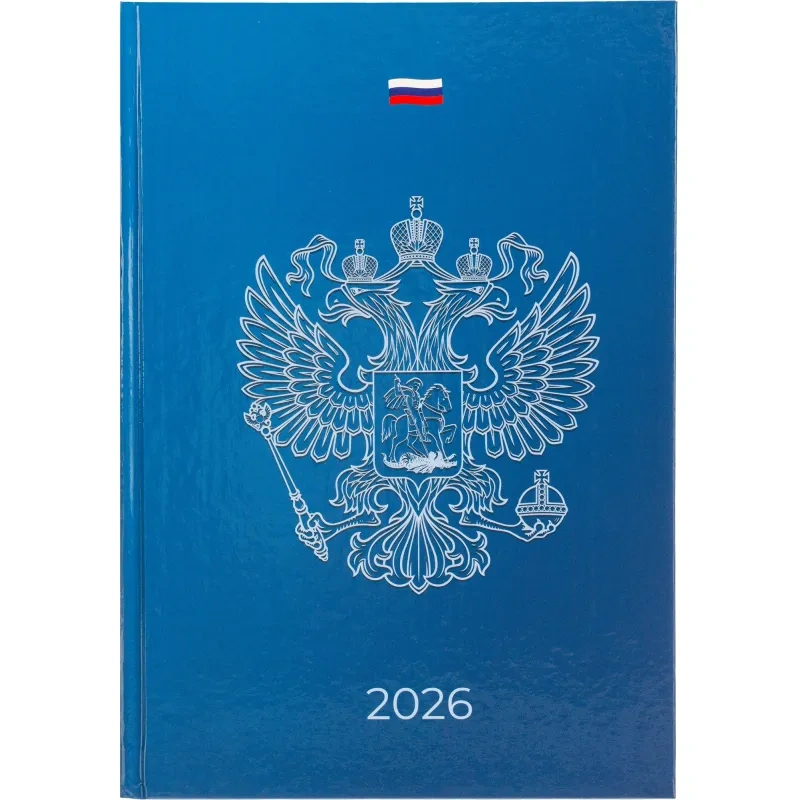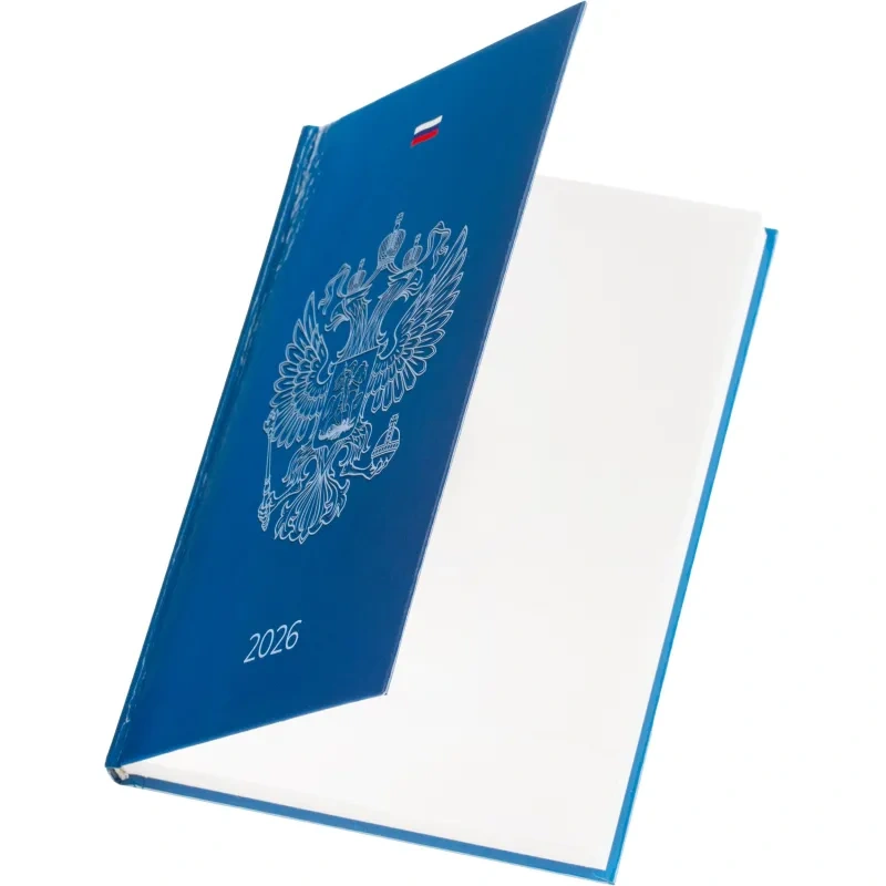 Ежедневник содержит информационно-справочный блок, включая личные данные и календарь на 2026-2029 годы. Он рассчитан на заполнение в течение одного года. В ежедневнике нет петли для ручки.