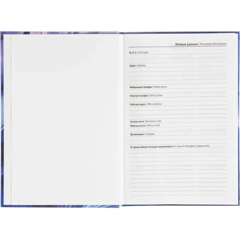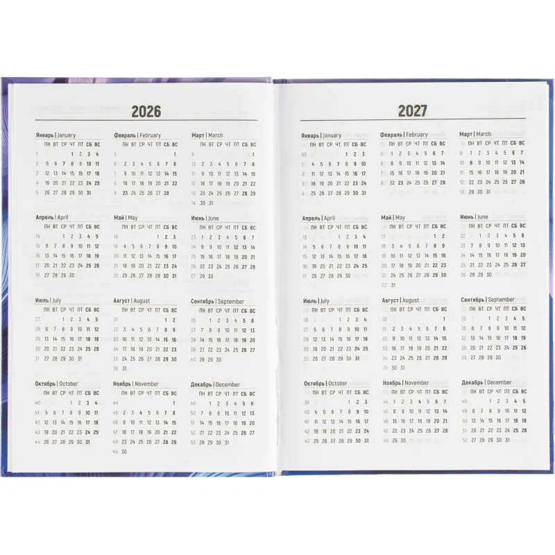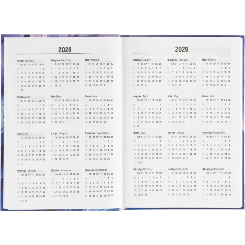 Ежедневник содержит информационно-справочный блок, включая личные данные и календарь на 2026-2029 годы. Он рассчитан на заполнение в течение одного года. В ежедневнике нет петли для ручки.