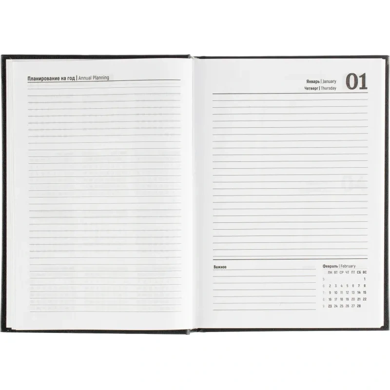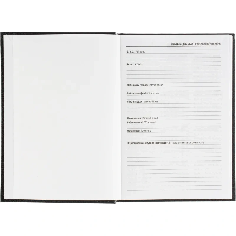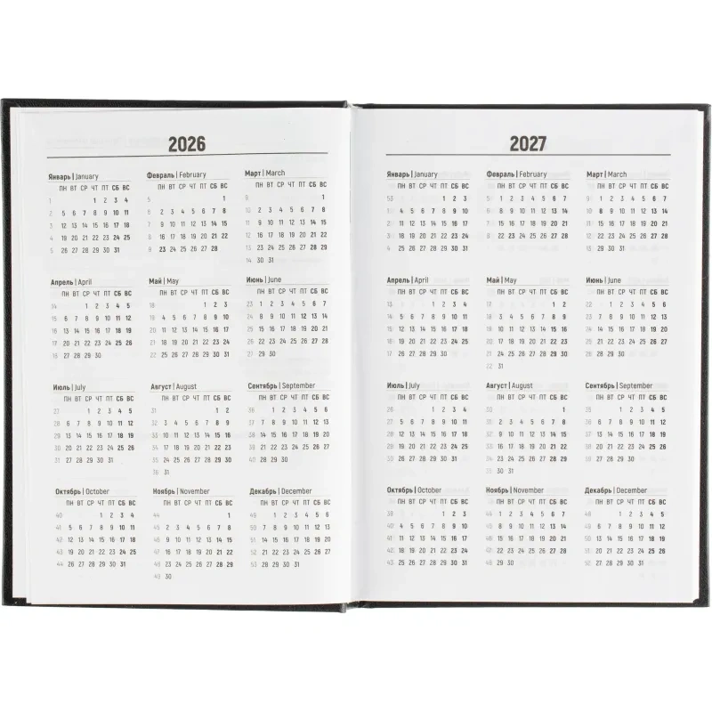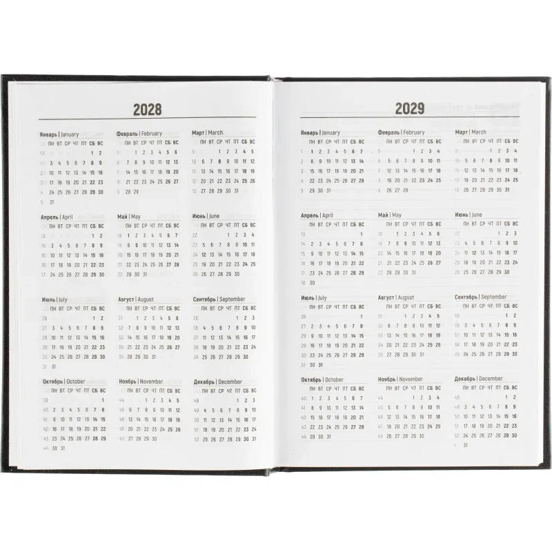 Ежедневник содержит информационно-справочный блок, включая личные данные и календарь на 2026-2029 годы. Он рассчитан на заполнение в течение одного года. В ежедневнике нет петли для ручки.