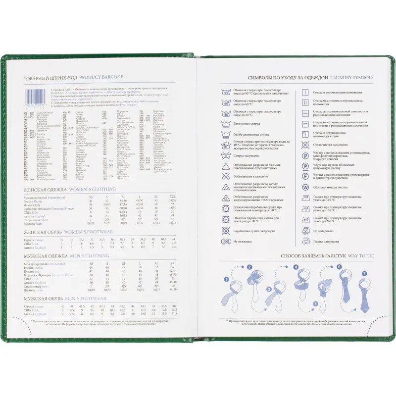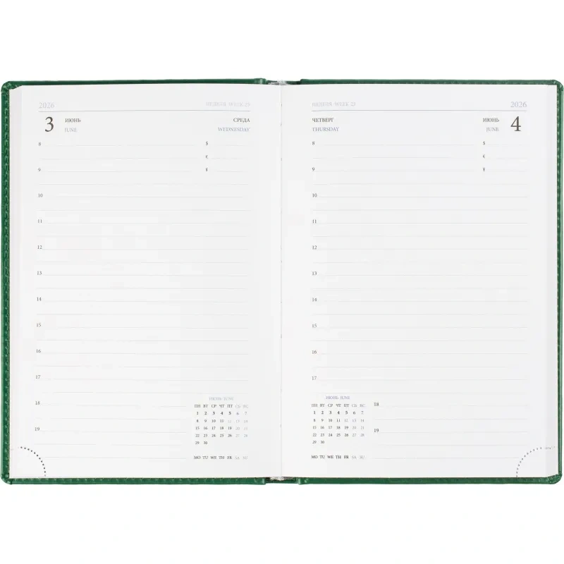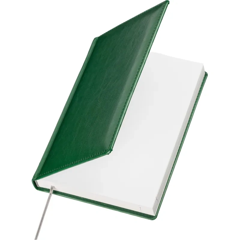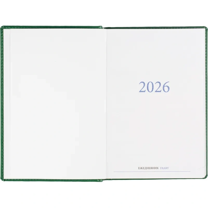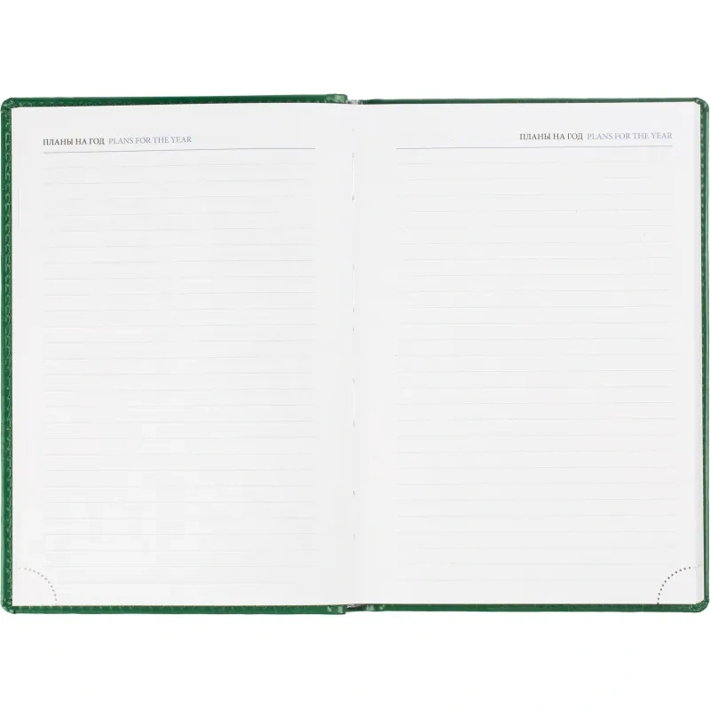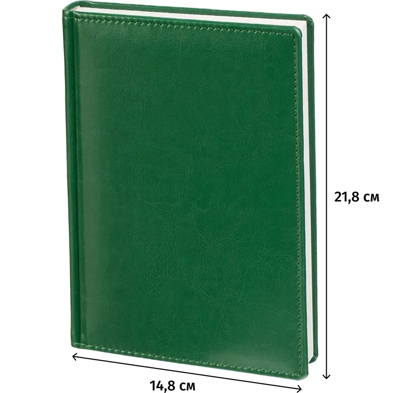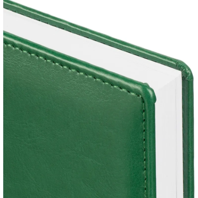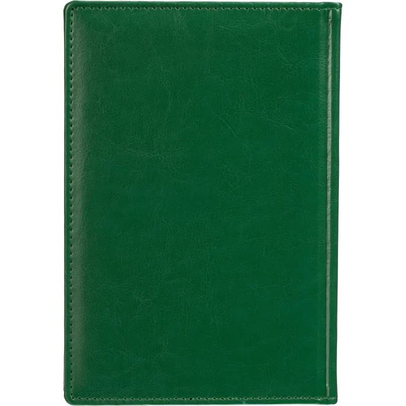 Данный ежедневник имеет формат A5, содержит 176 листов. Твёрдая обложка с поролоном, выполненная из высококачественной искуственной кожи зелёного цвета, придает изделию элегантный и профессиональный вид. Страницы выполнены из белой офсетной бумаги плотностью 70 г/кв.м. Дизайн обложки: универсальный.