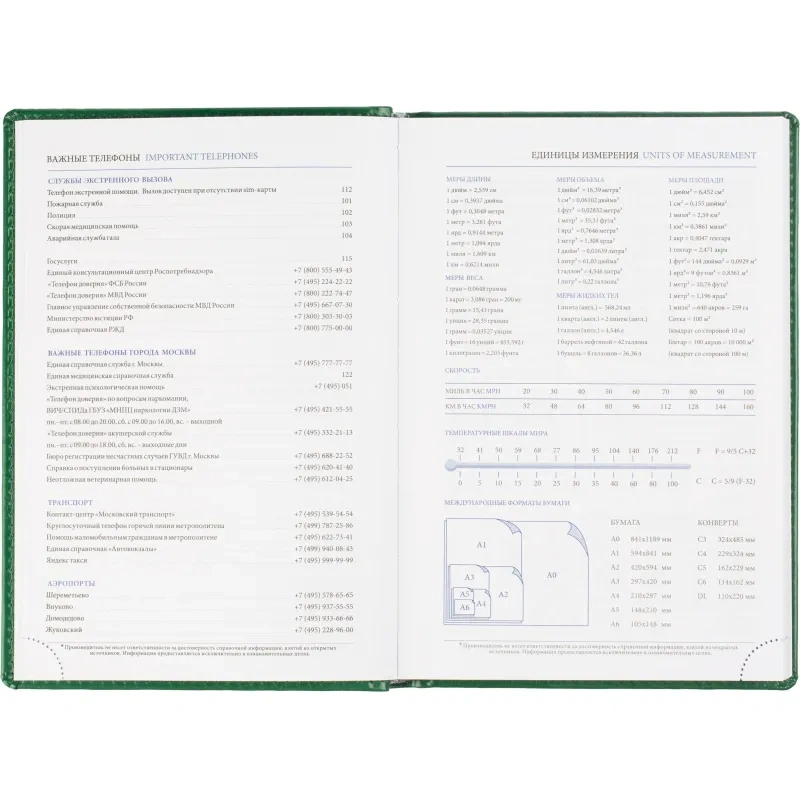 Ежедневник содержит информационно-справочный блок, включая личные данные, праздники, дни рождения и полезные сервисы. Блок также оснащен местами для записи регулярных платежей, важных телефонов и различных измерений. Перфорация уголка упрощает использование и добавляет удобства.