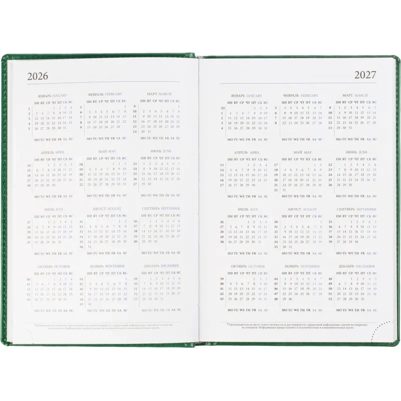 Среди дополнительных характеристик — ляссе серебристого цвета и уникальный блок, выполненный в двух цветах. На страницах предусмотрен календарь на 2026-2027 гг., что позволяет удобно планировать мероприятия и торжественные даты.