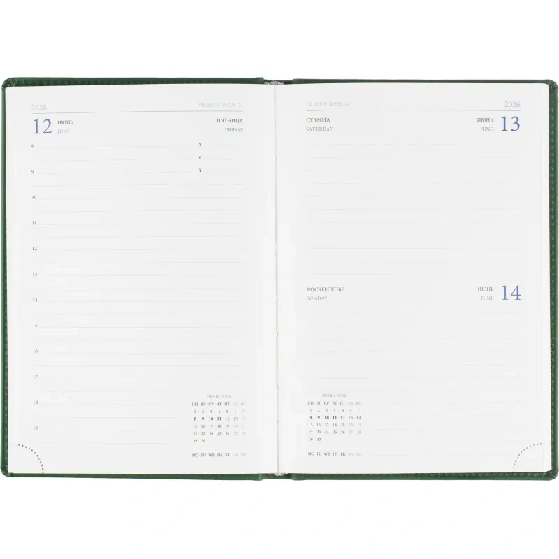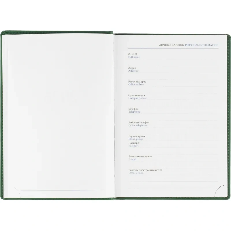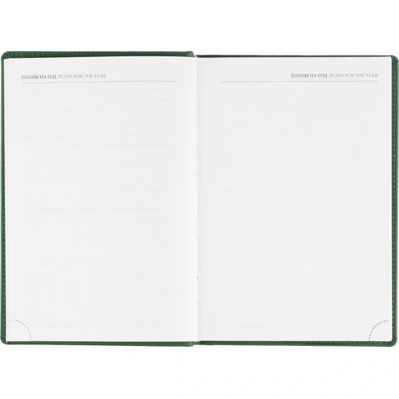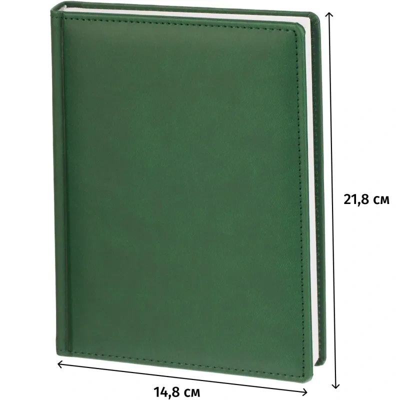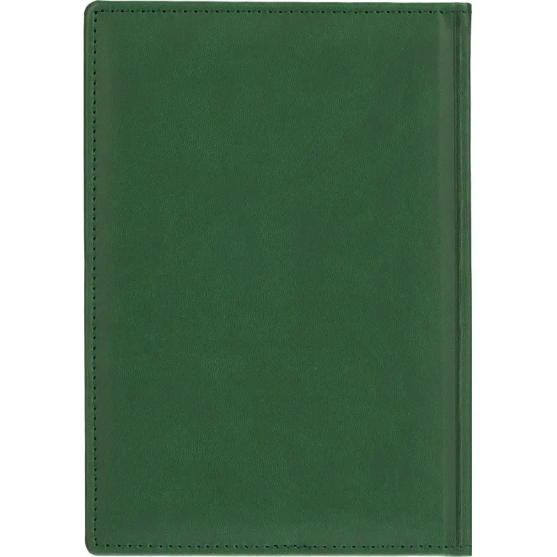 Данный ежедневник имеет формат A5, содержит 176 листов. Твёрдая обложка с поролоном, выполненная из высококачественной искуственной кожи зелёного цвета, придает изделию элегантный и профессиональный вид. Страницы выполнены из белой офсетной бумаги плотностью 70 г/кв.м. Дизайн обложки: универсальный.