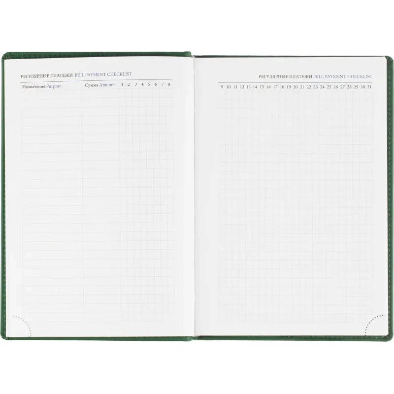 Ежедневник содержит информационно-справочный блок, включая личные данные, праздники, дни рождения и полезные сервисы. Блок также оснащен местами для записи регулярных платежей, важных телефонов и различных измерений. Перфорация уголка упрощает использование и добавляет удобства.