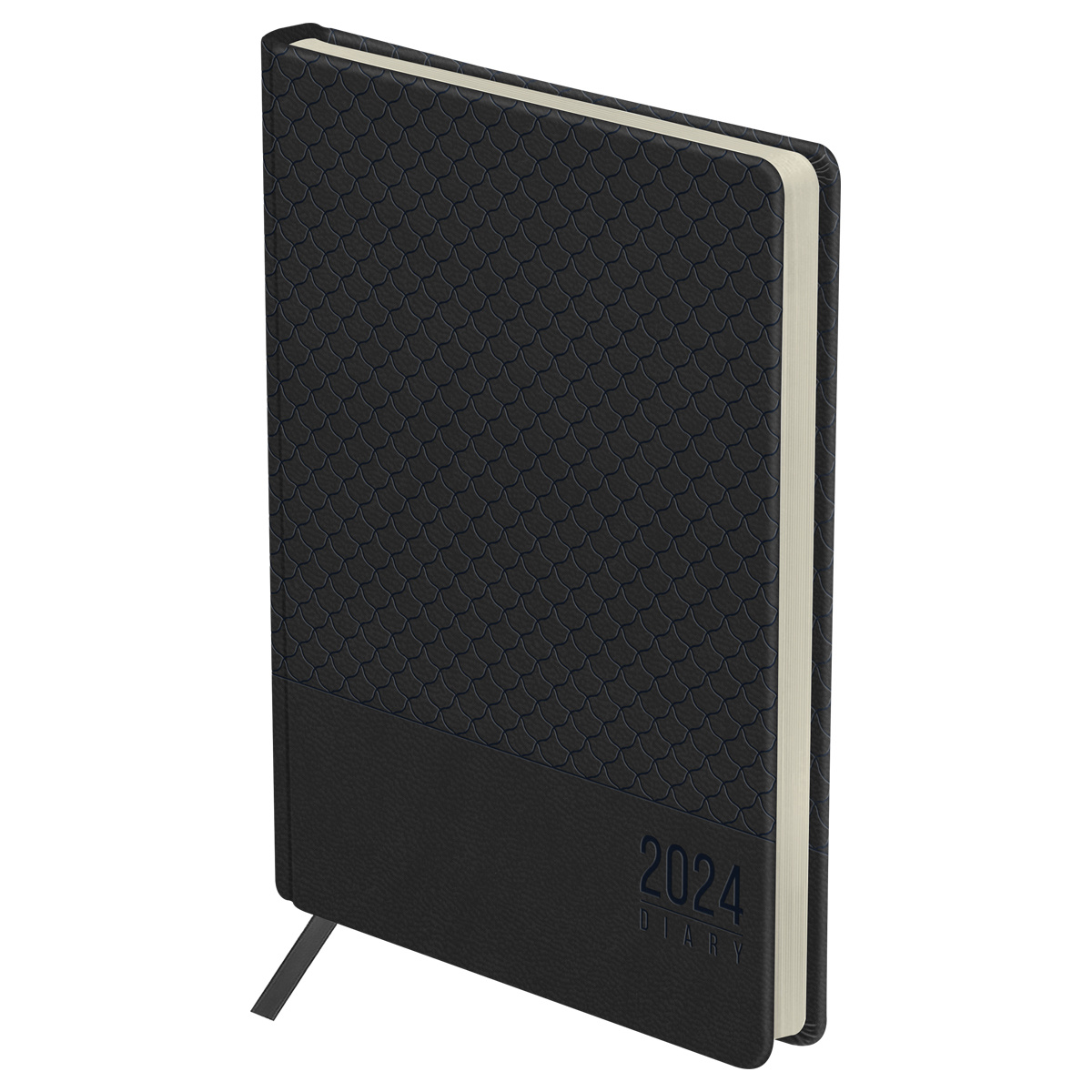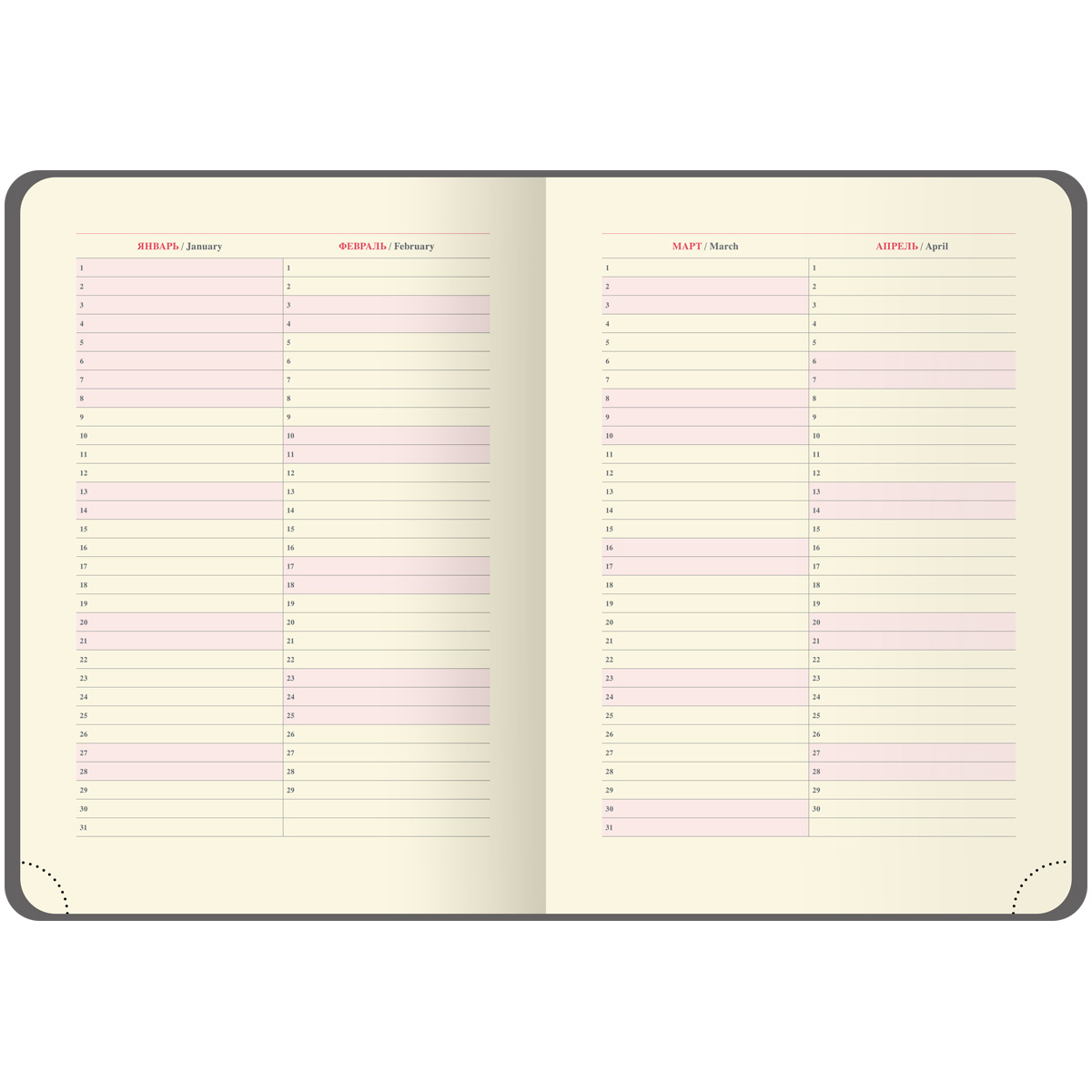 Ежедневник датированный формата А5 из коллекции «Pattern». Обложка изготовлена из высококачественного кожзаменителя, имитирующего натуральную глянцевую кожу, с поролоновой прослойкой, цвет обложки - графитовый. Подходит для всех видов полиграфического тиснения. Внутренний блок состоит из 176 листов офсетной бумаги плотностью 70 г/м2, печать блока в 2 краски, справочный материал. Удобная закладка-ляссе и перфорированные уголки.