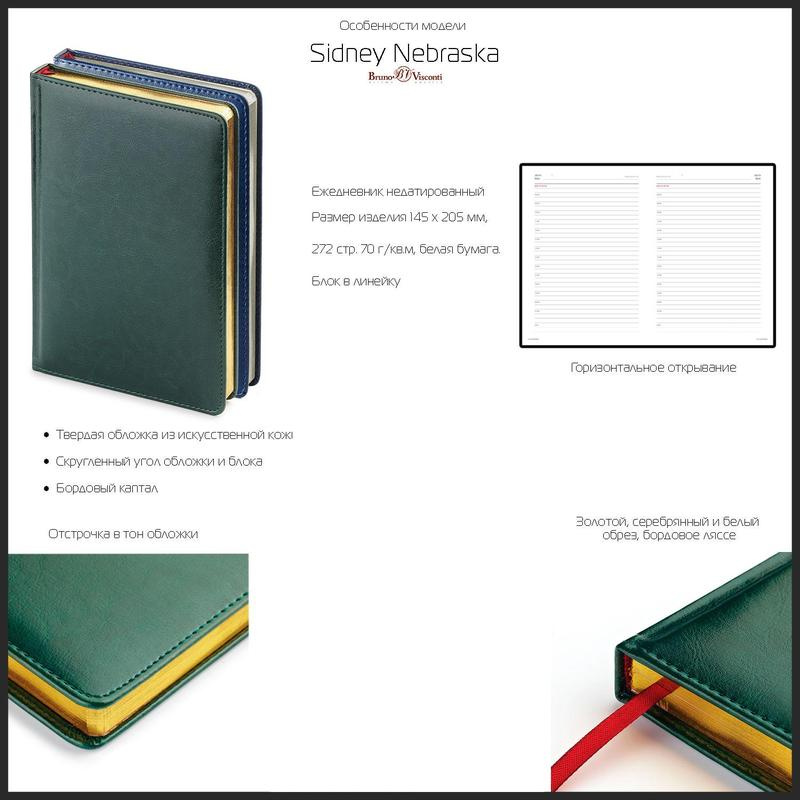 Благородный ежедневник датированный на 2023 год, серии Sidney Nebraska станет вам надежным и незаменимым помощником в 2023 г. Обложка ежедневника выполнена из искусственной кожи зеленого цвета, со строчкой по периметру в цвет. Переплет блока книжный. Срез блока «под золото». Цвет страниц белый с двухцветной печатью. Есть страница для личной информации. Ляссе блока бордовое. Подходит для персонализации.