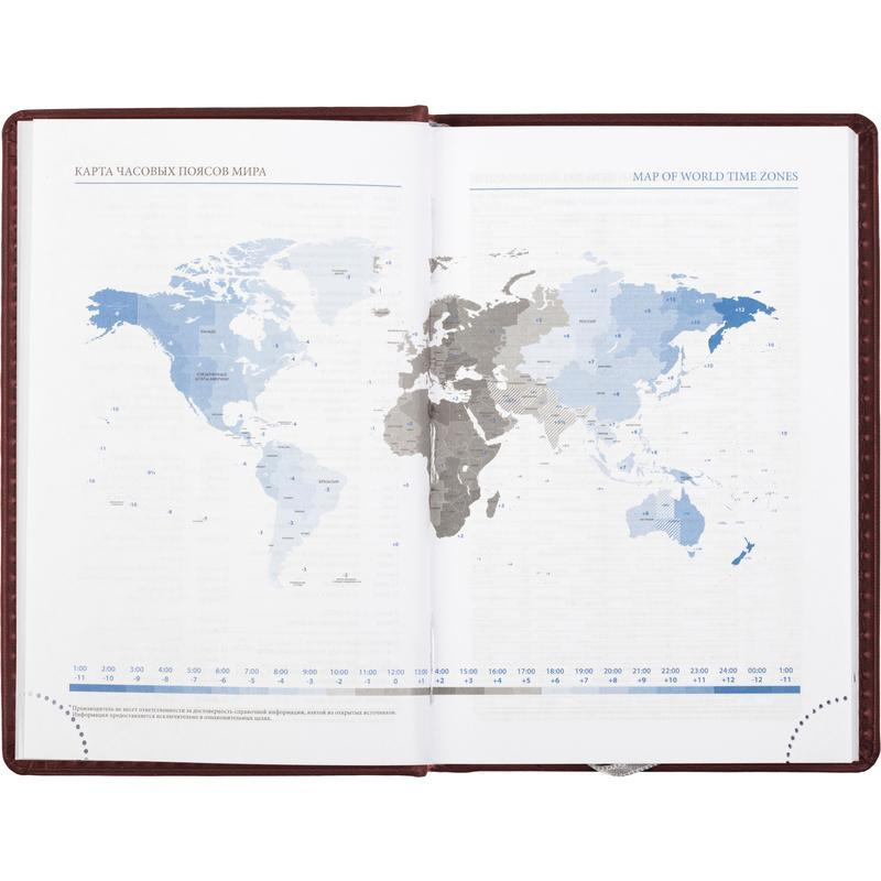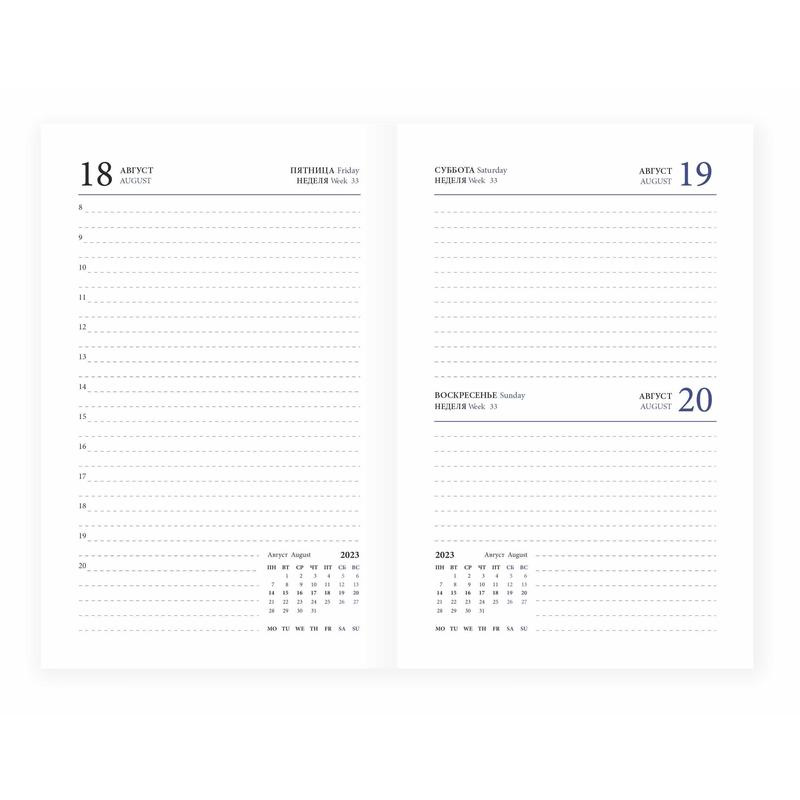 Ежедневник датированный 2023 год Attache Вива A6 100?150 мм. Однотонная обложка из высококачественного переплетного материала бордового цвета, имитирующего натуральную кожу, с поролоном. Гладкая фактура. По периметру отделочная строчка в цвет материала. Возможно нанесение логотипа на обложку любым способом тиснения. Блок: датированный 2023 г., белый офсет плотностью 70 г/кв.м (линейка), перфорация уголка, ляссе серебристого цвета, 168 листов (336 страницы), печать блока в 2 краски. Содержит информационно-справочный блок: личные данные; календарь 2023 г.; дни рождения; знаки зодиака; праздники; карта часовых поясов мира; информация по странам; основные аэропорты России и стран СНГ; основные европейские аэропорты; важные телефоны г. Москвы; международные коды городов РФ; цифровые коды ГИБДД; меры длины, веса, объема; температурные шкалы; международные форматы бумаги; товарный штрих-код; международные размеры одежды и обуви; символы по уходу за одеждой; планы на год. Блок для заметок.