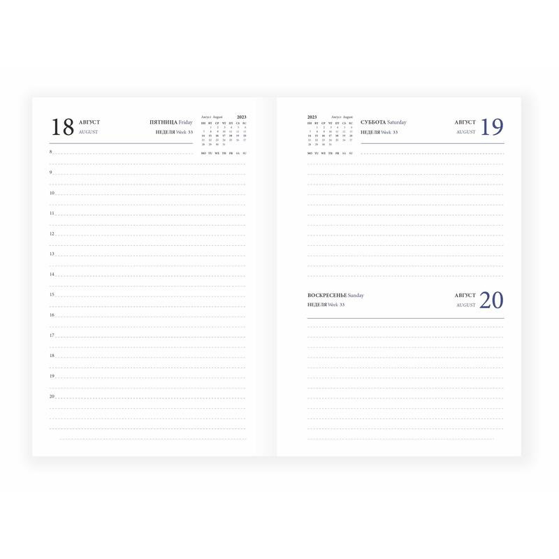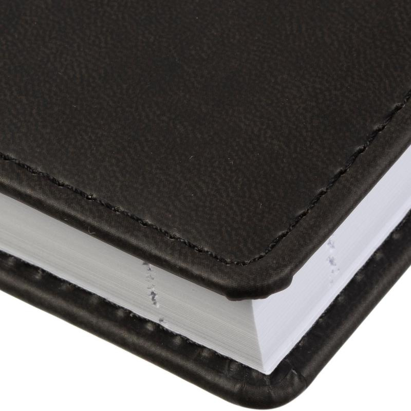 Ежедневник датированный 2023 год Attache Вива A5 148?218 мм. Однотонная обложка из высококачественного переплетного материала черного цвета, имитирующего натуральную кожу, с поролоном. Гладкая фактура. По периметру отделочная строчка в цвет материала. Возможно нанесение логотипа на обложку любым способом тиснения. Блок: датированный 2023 г., белый офсет плотностью 70 г/кв.м (линейка), перфорация уголка, ляссе серебристого цвета, 176 листов (352 страницы), печать блока в 2 краски. Содержит