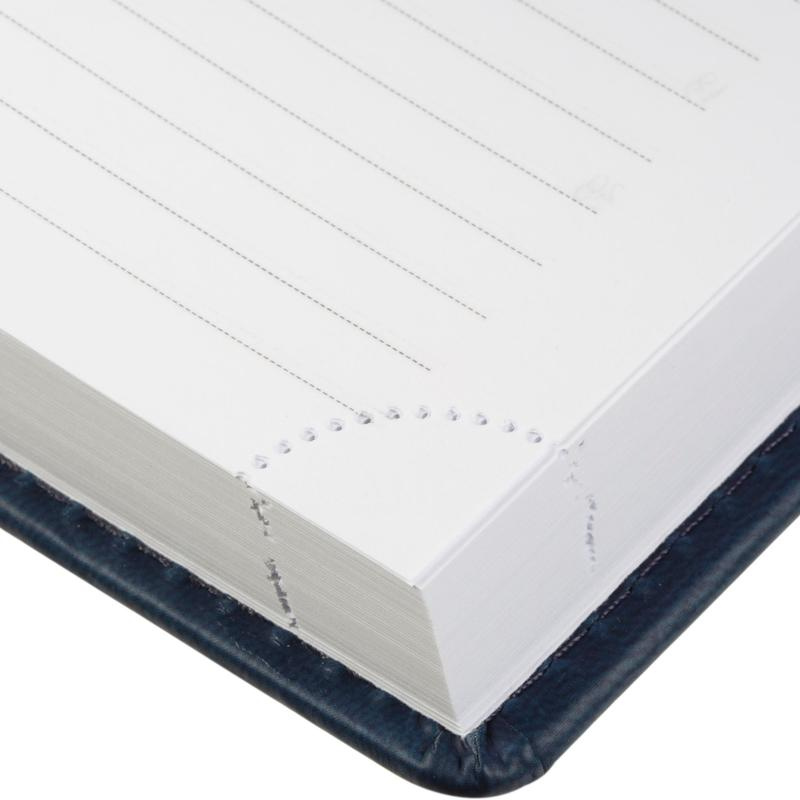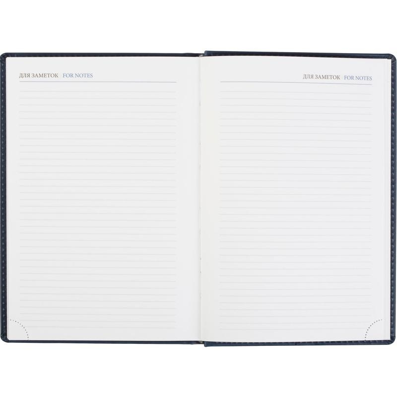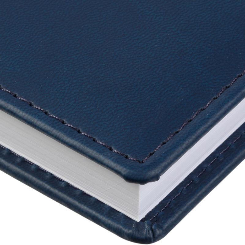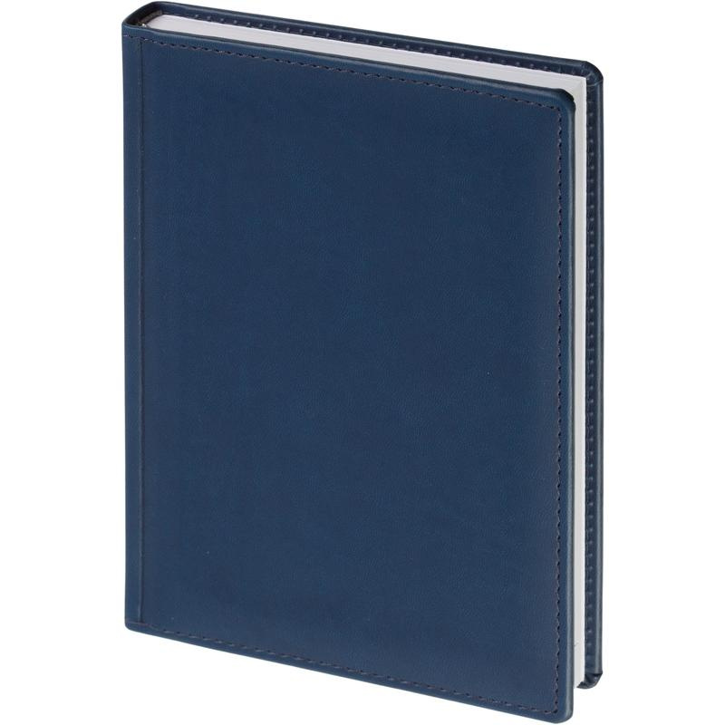 Ежедневник датированный 2023 год Attache Вива A5 148?218 мм. Однотонная обложка из высококачественного переплетного материала синего цвета, имитирующего натуральную кожу, с поролоном. Гладкая фактура. По периметру отделочная строчка в цвет материала. Возможно нанесение логотипа на обложку любым способом тиснения. Блок: датированный 2023 г., белый офсет плотностью 70 г/кв.м (линейка), перфорация уголка, ляссе серебристого цвета, 176 листов (352 страницы), печать блока в 2 краски. Содержит